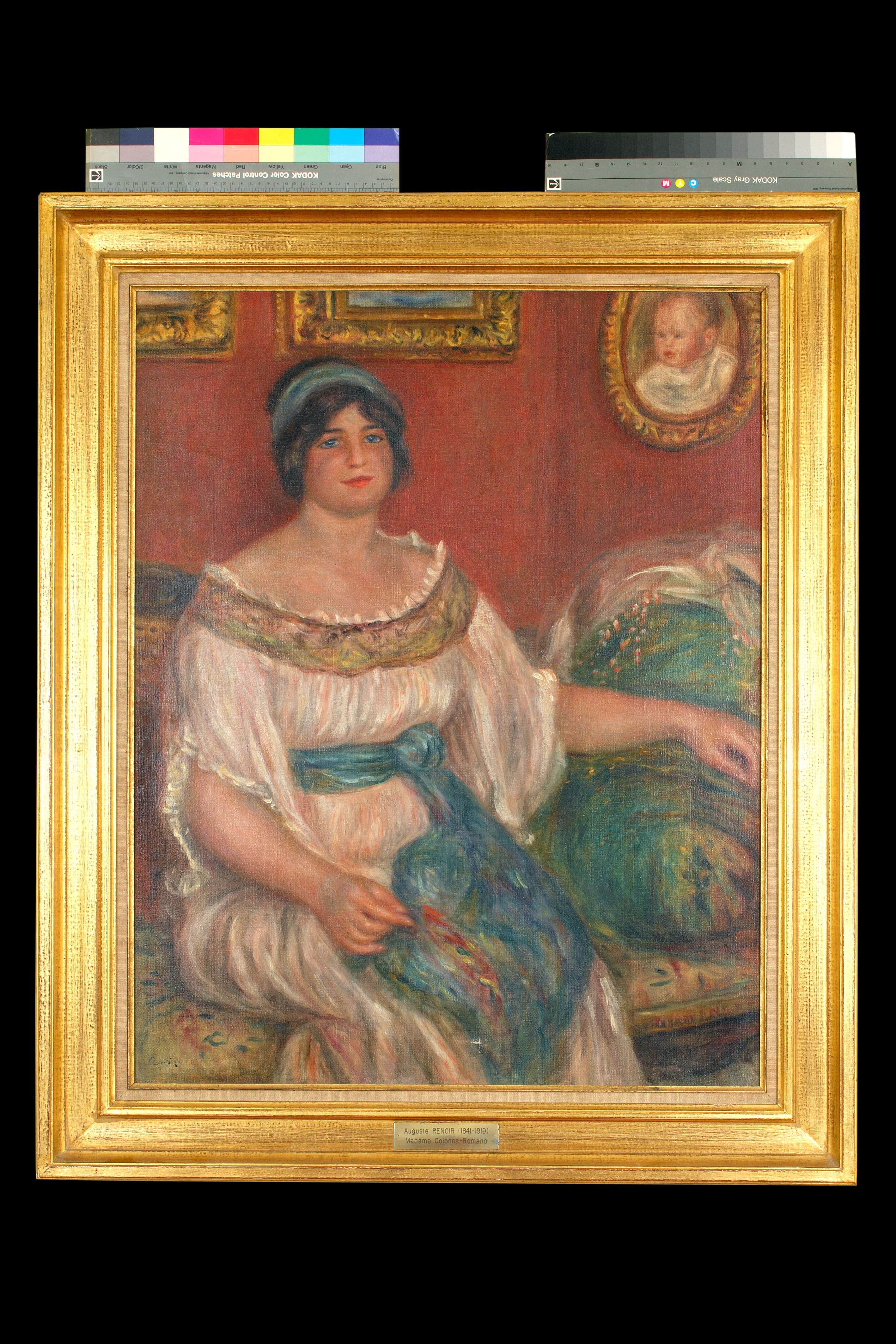 portrait (Colonna Romano Mme, femme, pièce d'habitation, assis, de trois-quarts, robe, coiffure, canapé, coussin, tissu, tableau : portrait, en médaillon)