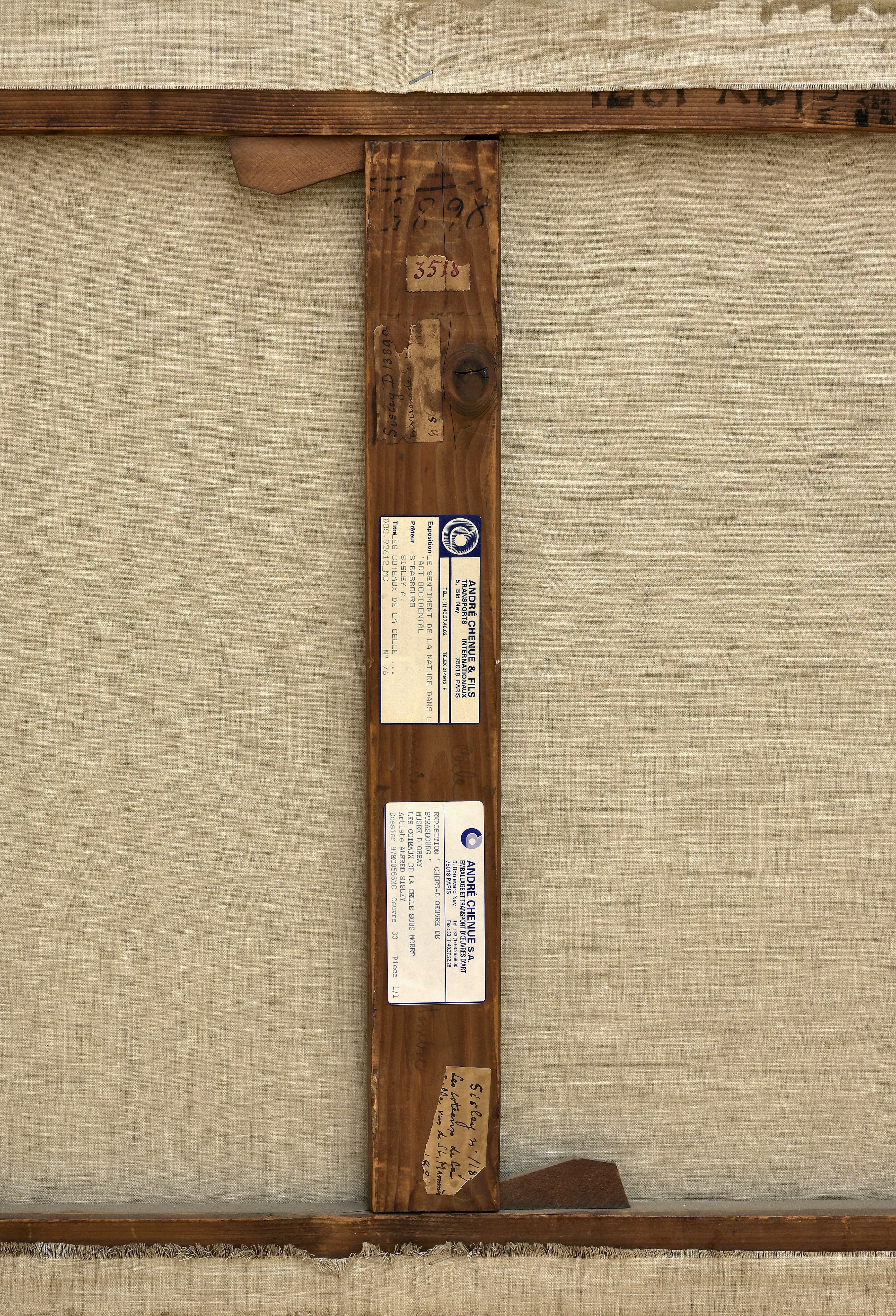 -Montant médian : étiquette rectangulaire lacunaire, à l'encre noire « Sisley D 13890/environs de la .../1880/n° 5600 (?) » ; étiquette blanche rectangulaire à bords dentelés à l'encre rouge « 3518 » ; inscription à l'encre noire « 8635 » souligné deux fois ; étiquette rectangulaire déchirée « Sisley n° 11./Les coteaux de la /[Ce]lle vus de St.Mammès/188... » ; deux étiquettes rectangulaires illisibles ; étiquette rectangulaire « André Chenue et fils/transports internationaux/5bd Ney 75018 Paris/Tél 1-40374662 Télex 214913 F/Exposition : le sentiment de la nature dans l/'art occidental/Prêteur : Strasbourg/Sisley A/Titre: Les coteaux de la Celle .../DOS.92612 MC N°76 » ; étiquette rectangulaire : « André Chenue SA/Emballages et transports d’œuvres d'art 5 boulevard Ney Tél. 33(1)53266800/75018 Paris Fax 33(1)40372228 /Exposition : Chefs d’œuvre de/Strasbourg/Musée d'Orsay/Les coteaux de la Celle sous Moret/Alfred Sisley/Dossier 97CO566MC Œuvre 33 Piece 1/1 » ; cette étiquette en recouvre une autre qui masque une inscription au crayon « Celle/Mammès.../... embre ».