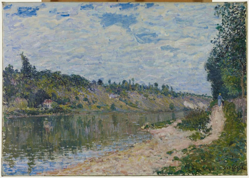 Sur le cadre : Étiquette rectangulaire, écrit à la main « SISLEY Alfred/Les coteaux de la Celle vus de st Mammès ».