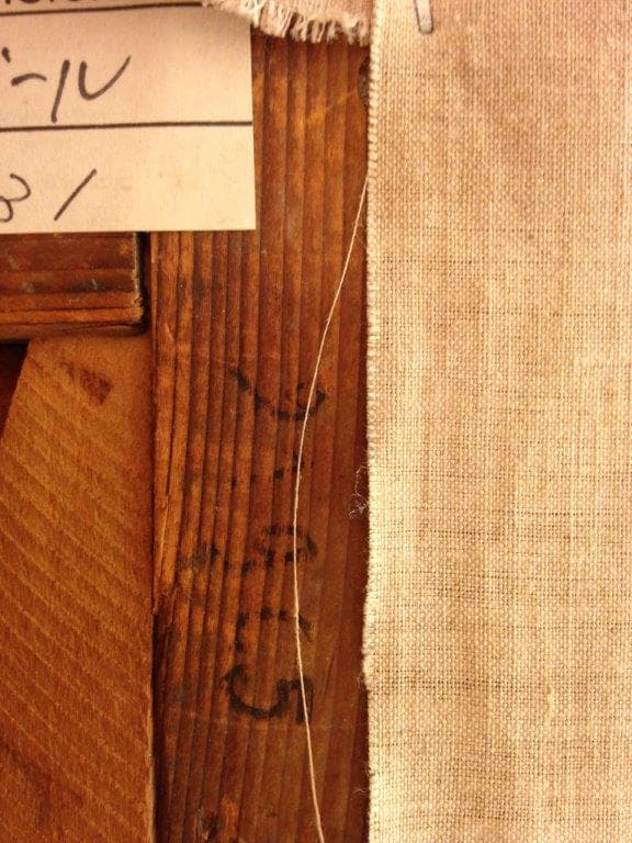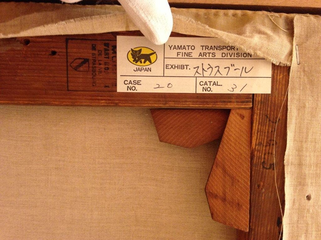 -Montant gauche : étiquette rectangulaire « Japan-Yamato transport .../fine arts divisions/exhibt. : [caractères japonais]/Case no 20-Catal./n° 31 » ; sous l'étiquette, tampon « Musée/d'art moderne/de la ville/de Strasbourg » ; « 20915 » ou « 21915 ».