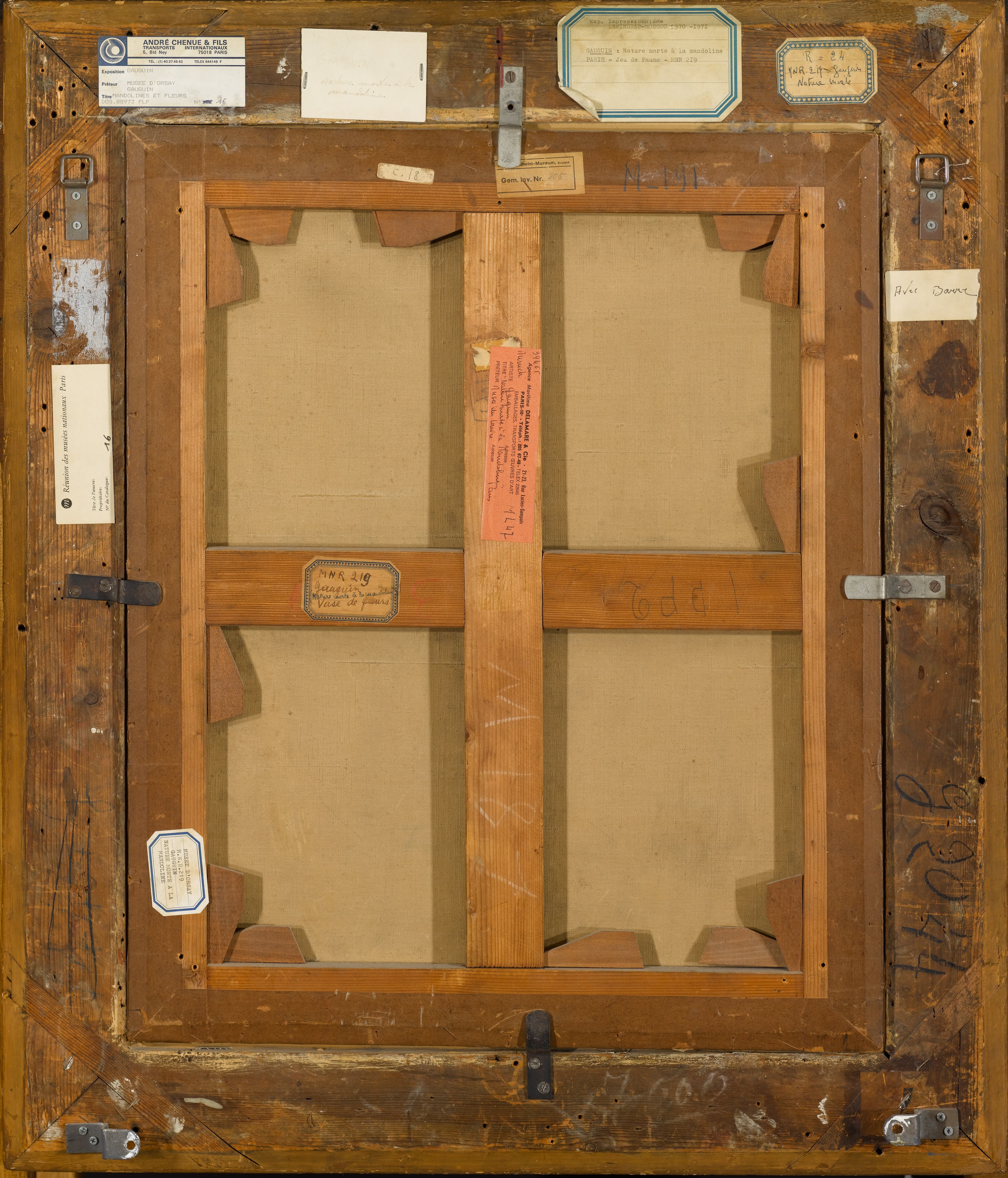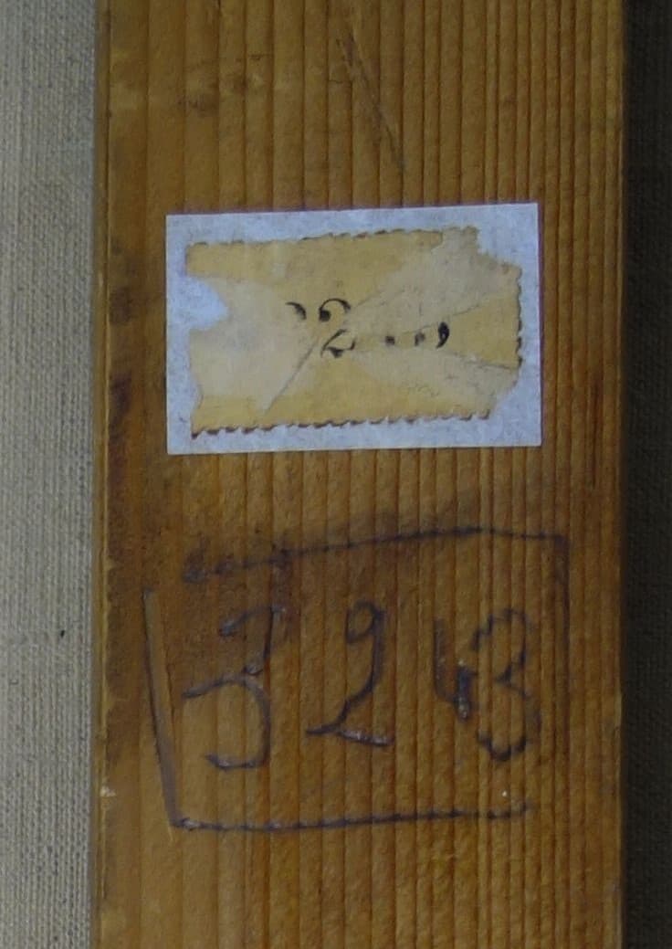 - Cadre du châssis : « M 191 » ; étiquette « Kaiser Wilhelm Museum n° 205 » ; « 230 » au graphite ; traverse verticale du châssis : « 3243 » au crayon gras bleu, encadré, (n° de stock Vollard) et étiquette imprimée correspondante mais ruinée ; traverse horizontale du châssis : « 3329 » à la craie rouge (n° de photo Bignou).