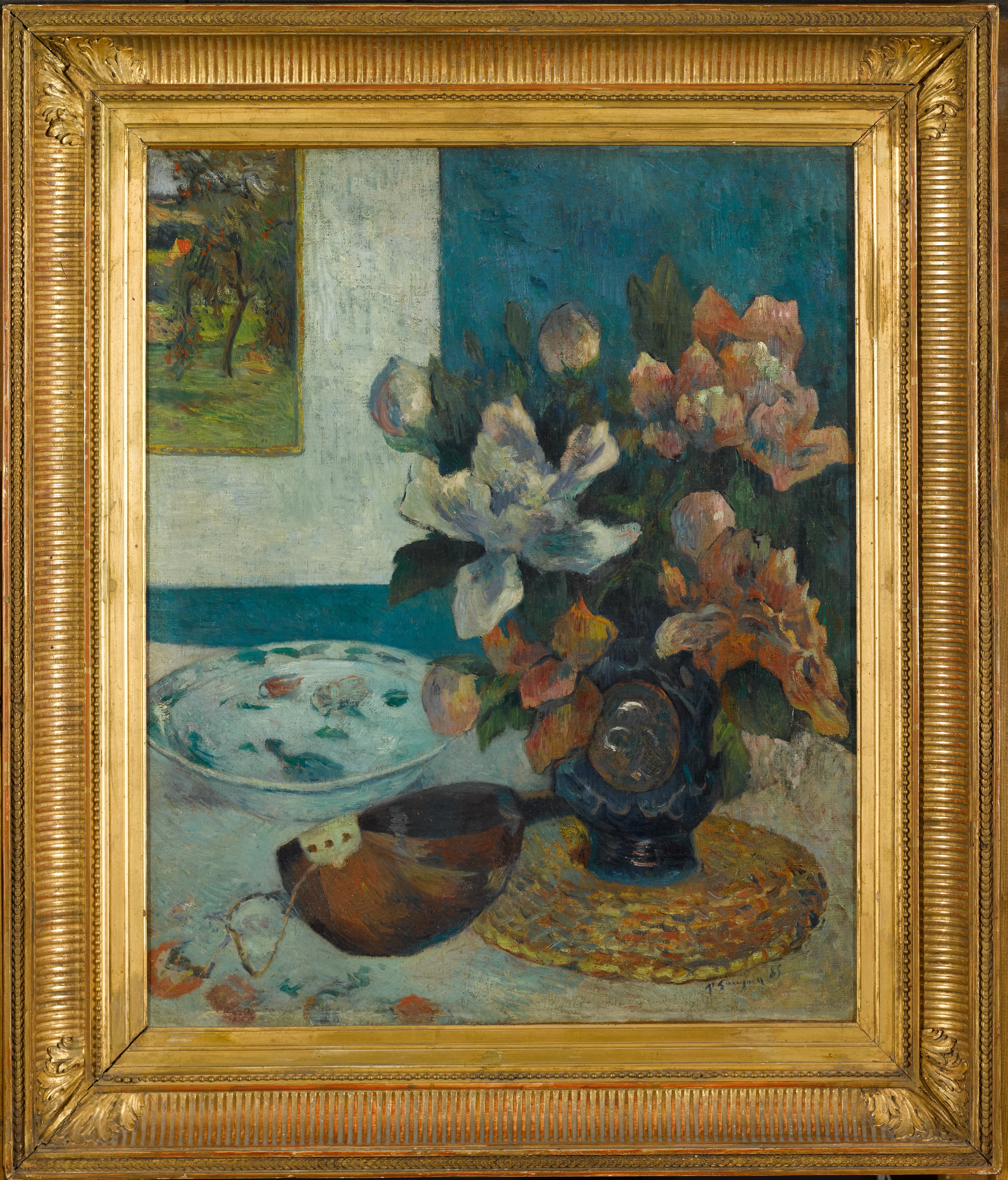 nature morte (pivoine, vase, mandoline, plat : céramique, peinture) ; peinture (paysage, verger)