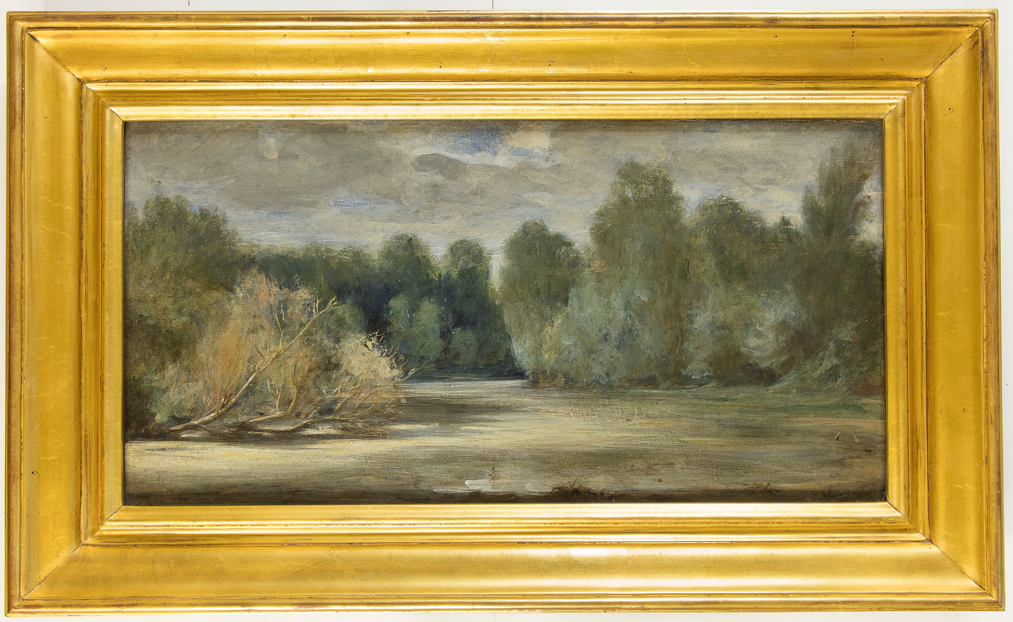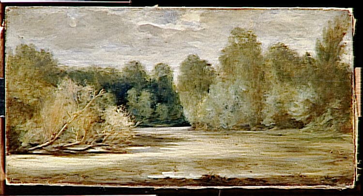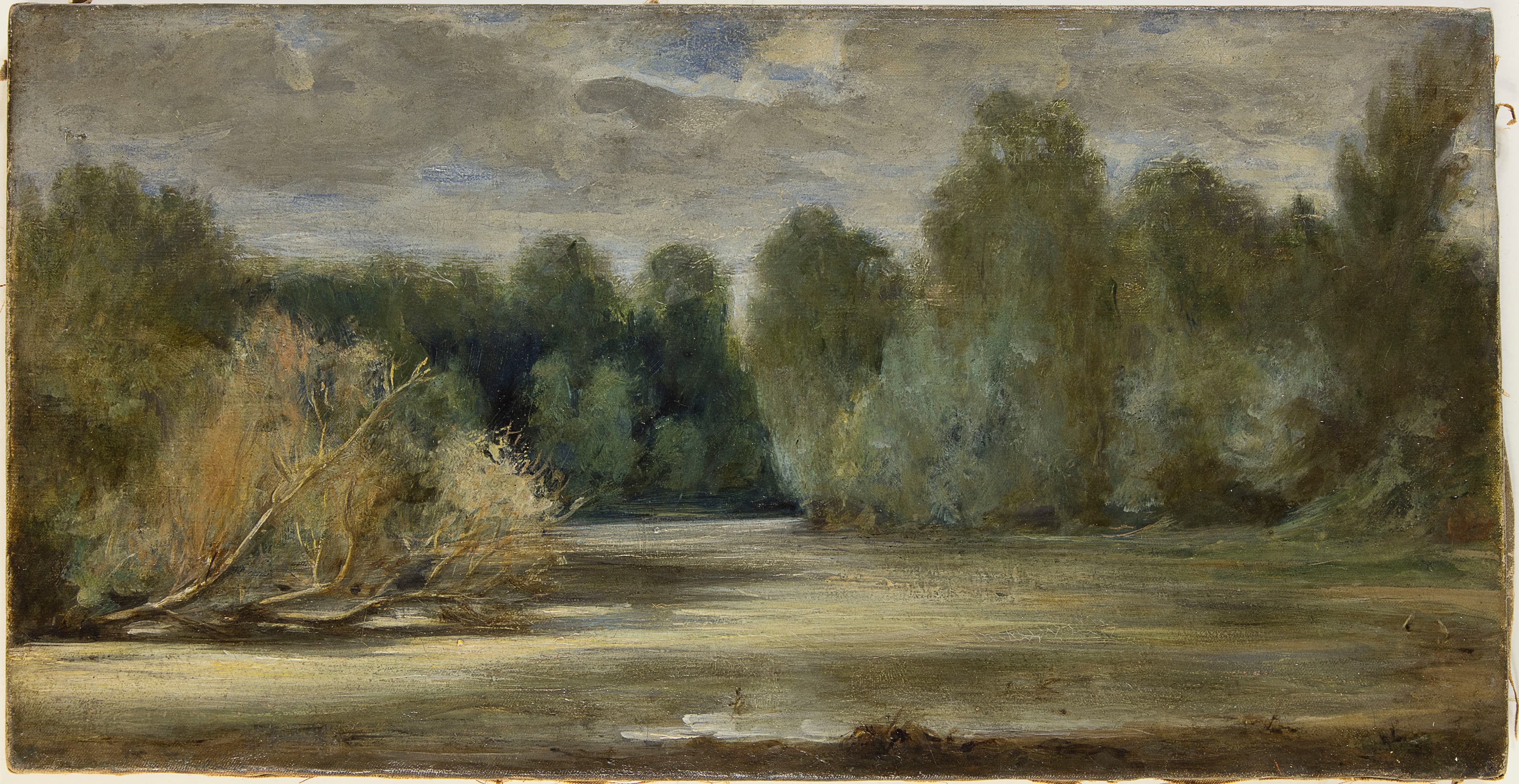 Traditionnellement considéré comme un Delacroix, ce tableau fut attribué à Pierre Andrieu (1821-1892) en suivant les avis donnés par Lee Johnson en 1966 et en 1983. Mais Jean-Luc Stéphant a réattribué ce paysage à Delacroix, en identifiant le site : l'étang de Beauregard au Louroux, près de Tours, et en datant le tableau du séjour du peintre en Touraine en 1822. Le style de ce paysage semble plus proche de ceux peints par Delacroix à Frépillon ou Champrosay, entre 1842 et 1844.