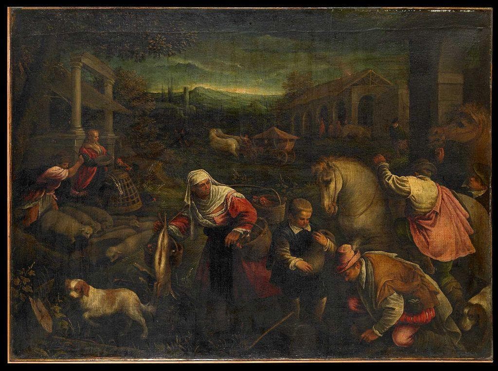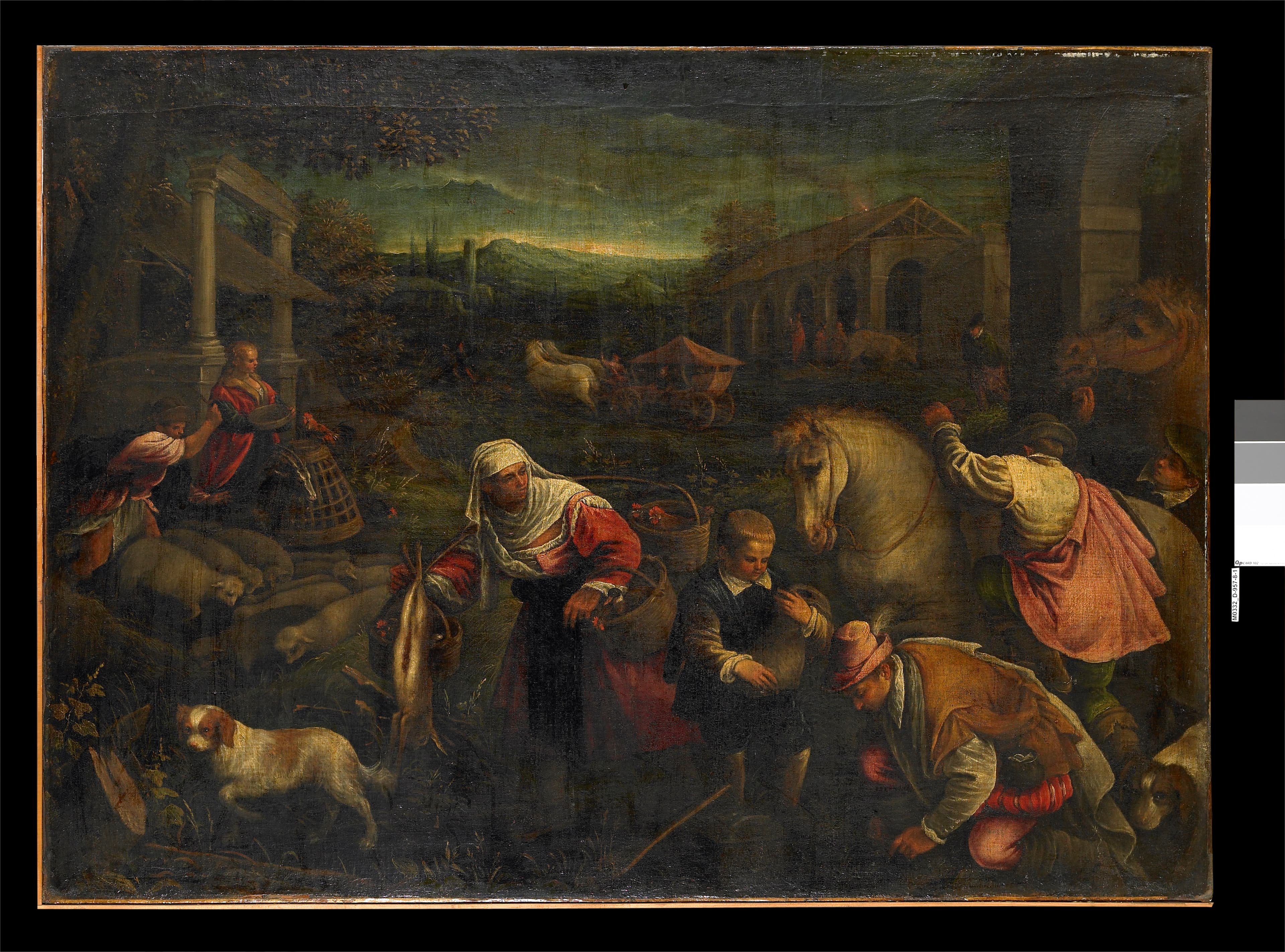 scène (marché, foule, homme, femme, nourriture, chien, capriné : chèvre, mouton, léporidé, cavalier, cheval, panier, cage, végétation) ; fond de paysage (architecture, colonne, portique, maison, charrette, feuillu)