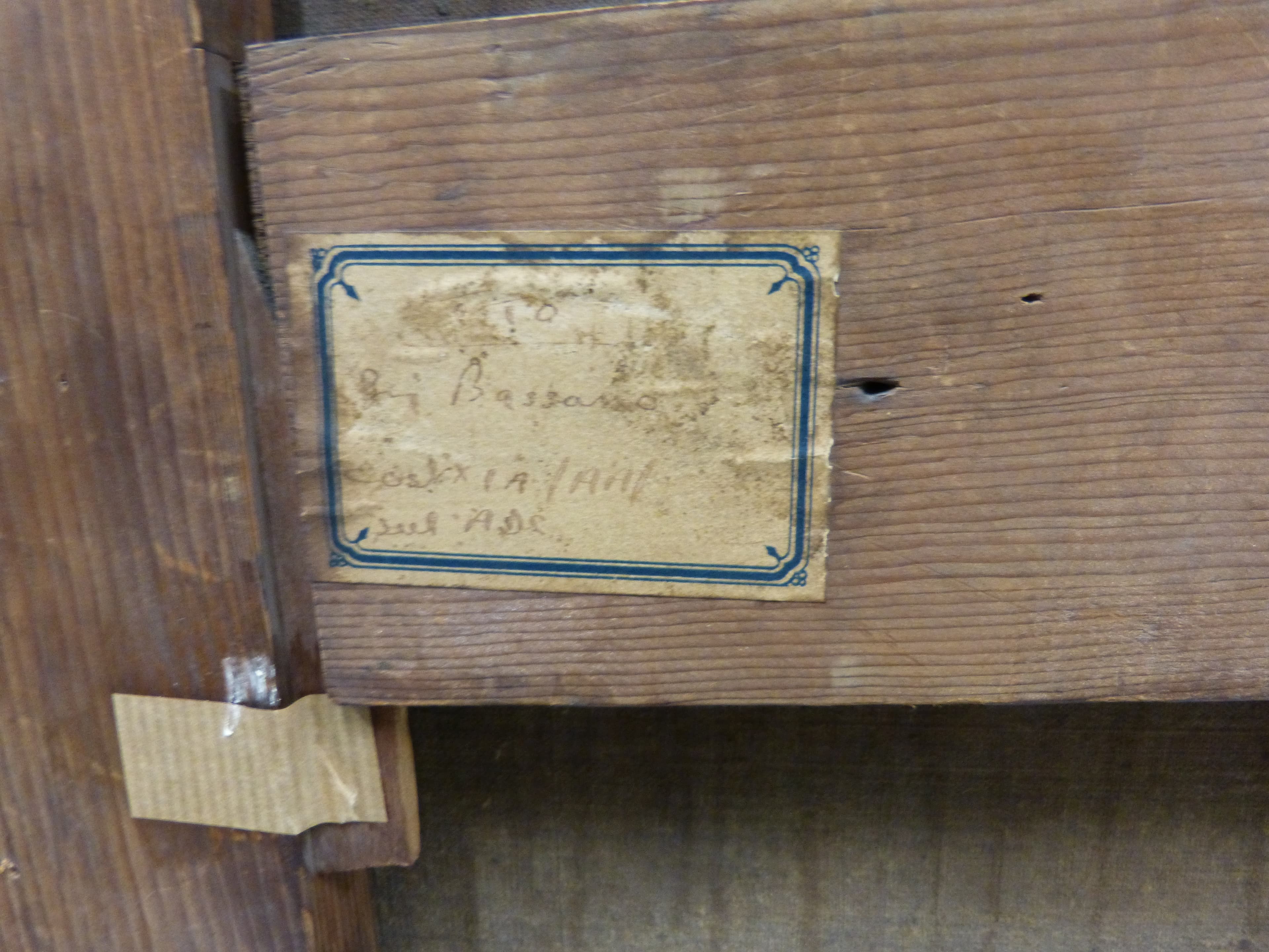 Sur la traverse médiane : Étiquette rectangulaire avec listel orné aux coins de trois billes et piques bleues « MNR 255/Ec. Bassano/Cost XIA/AA/ sur ADC ».