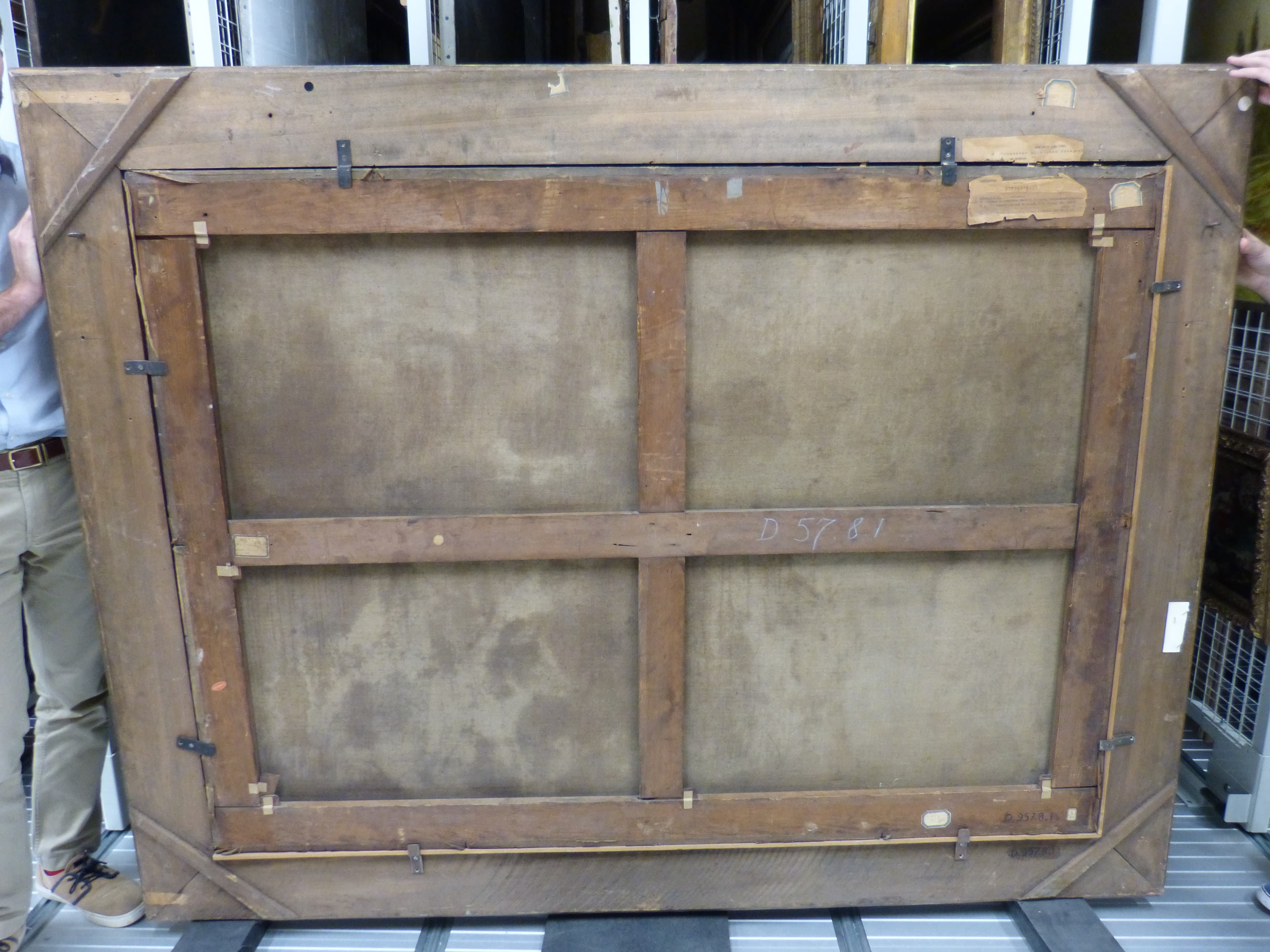 Sur le montant supérieur et cadre : Étiquette rectangulaire lacunaire dactylographiée «Linz le 12 juin 1946/Gouvernement militaire français/en Autriche/...Ober-Osterreich achats des .../Provenance [...déchiré]/Contenu/caisse n° 12/Caisse GP 12 (3 tableaux)/N°73 Tableau : La sculpture, école de Véronèse 3/4 grandeur nature/35 a [tableau]Paysans rentrant du marché, école Bassano XVI siècle/125X170 / 51[Tableau]Festin au bord d'un fleuve. Cornillet 1887 173X103 » ; étiquette rectangulaire coupée en deux à coins coupés avec listel bleu inscriptions illisibles.