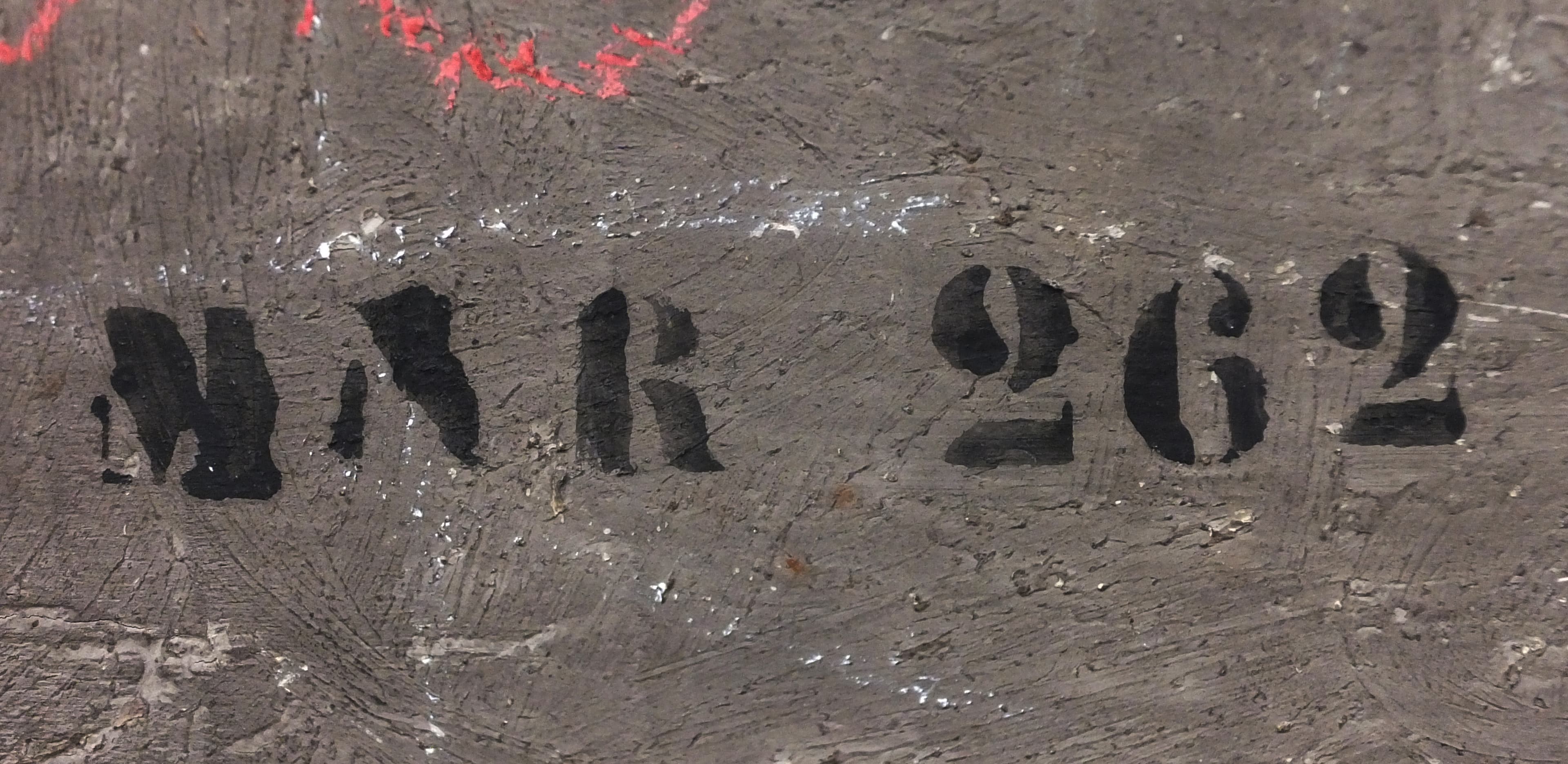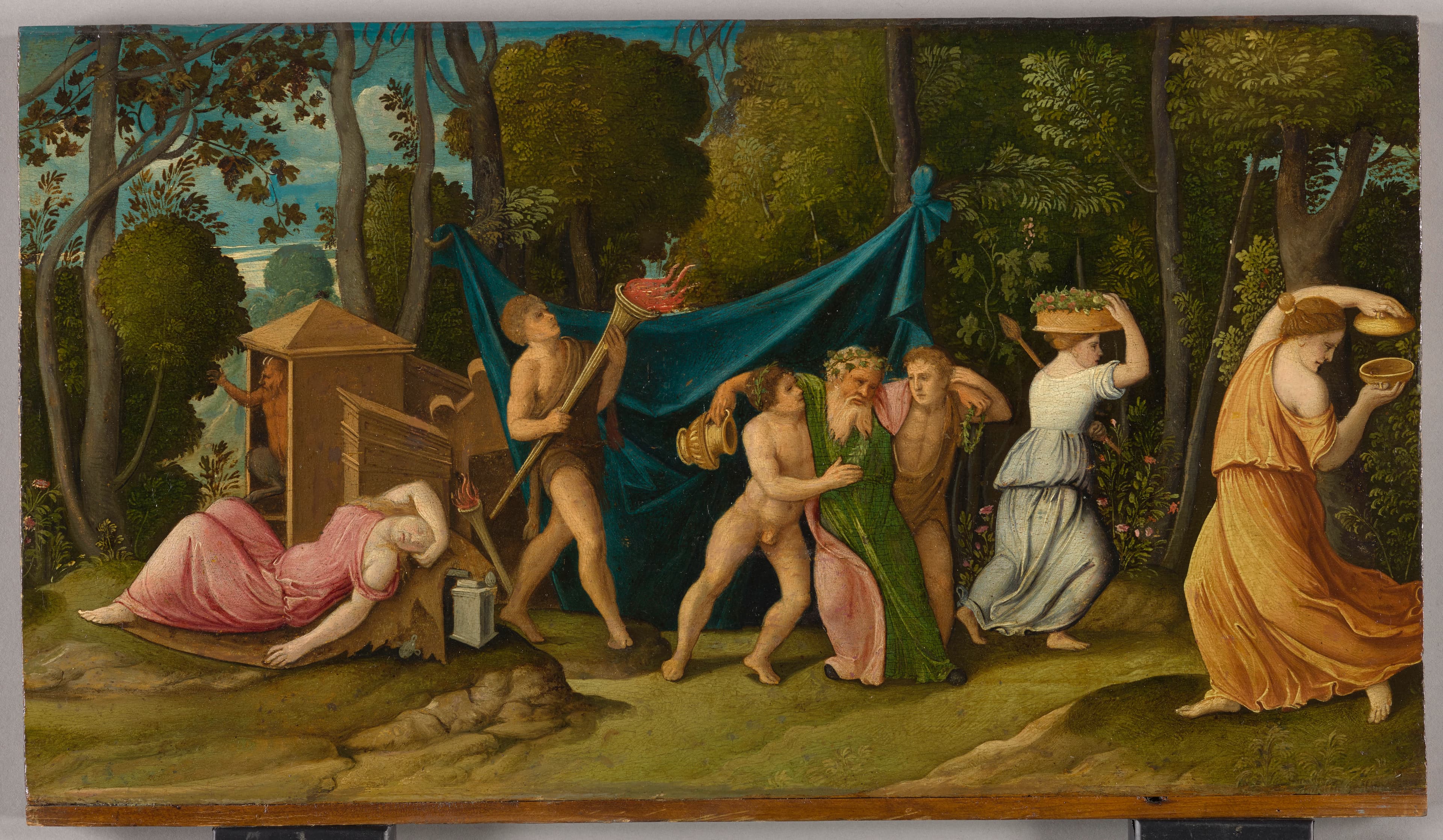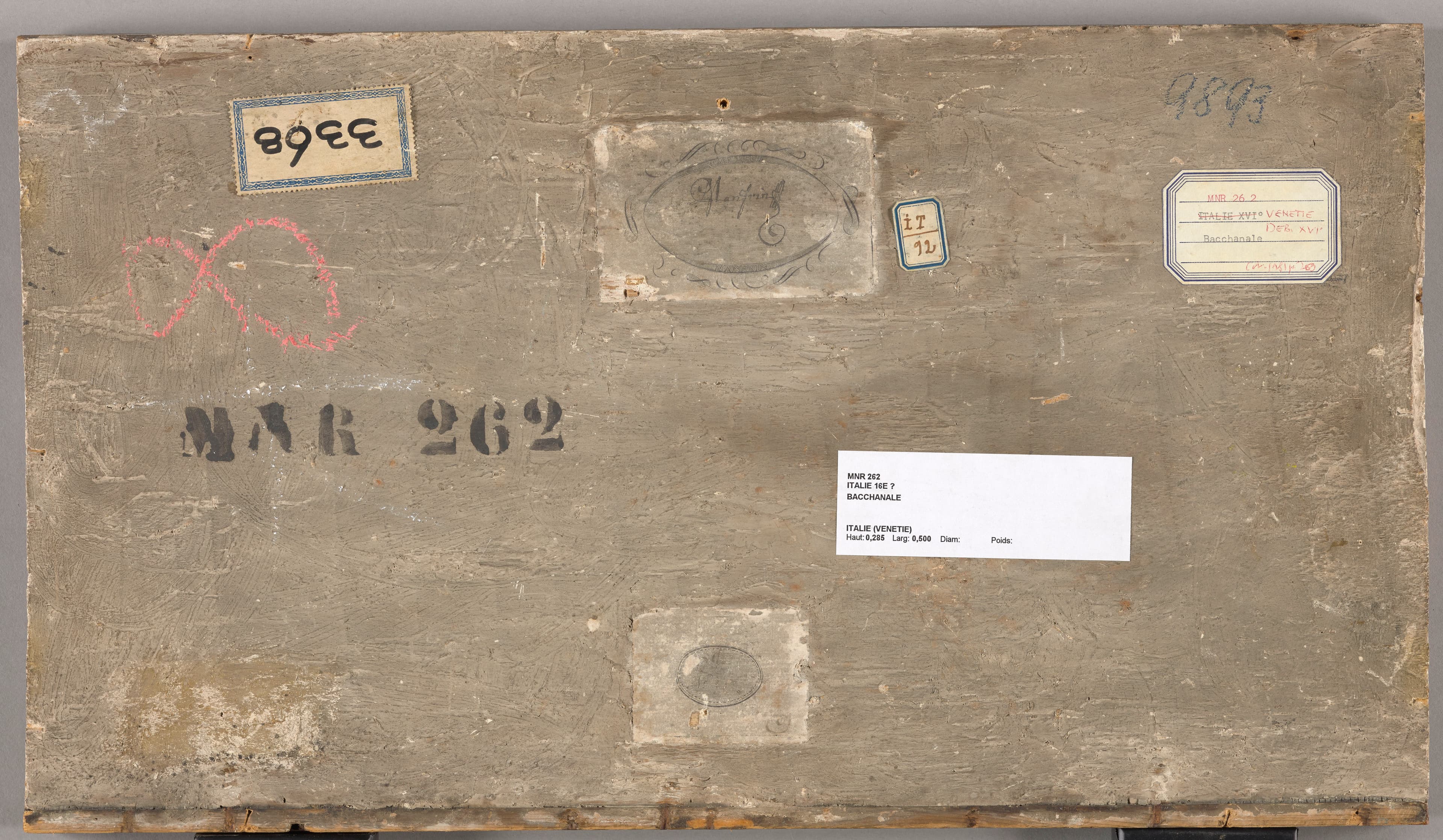 Au revers du panneau : Au tampon noir "MNR 262" ; à la craie blanche "2 (?)" ; à la craie bleue "9893" ; à la craie rouge "8" ; étiquette rectangulaire avec tampon ovale "Galleria/ Manfrin. G Manfrin" ; étiquette rectangulaire avec tampon ovale très effacé "N° ... (?) ; étiquette rectangulaire à bord dentelé et listel bleu orné d'un rang d'oves et cabochons "3368" ; étiquette rectangulaire à coins coupés et listel bleu "It/92" ; étiquette rectangulaire à coins coupés et listel bleu "MNR 262/Italie XVI° (biffé) Vénétie Deb XVI°/Bacchanale/... (au crayon rouge illisible)" ; étiquette rectangulaire "MNR 262/Italie XVI°?/Bacchanale/Italie (Vénétie)/Haut. : 0,285 Larg. : 0,500 Diam. Poids" ; étiquette noire attachée "18 Vénétie Bacchanale" ; étiquette rectangulaire à coins coupés attachée "Shipped by/ Sté Nouvelle Atlantic/International Forwarding Agents/62, rue Mirabeau/94200 Ivry (France)/'Sea on Back' Tél. 672 74 36".