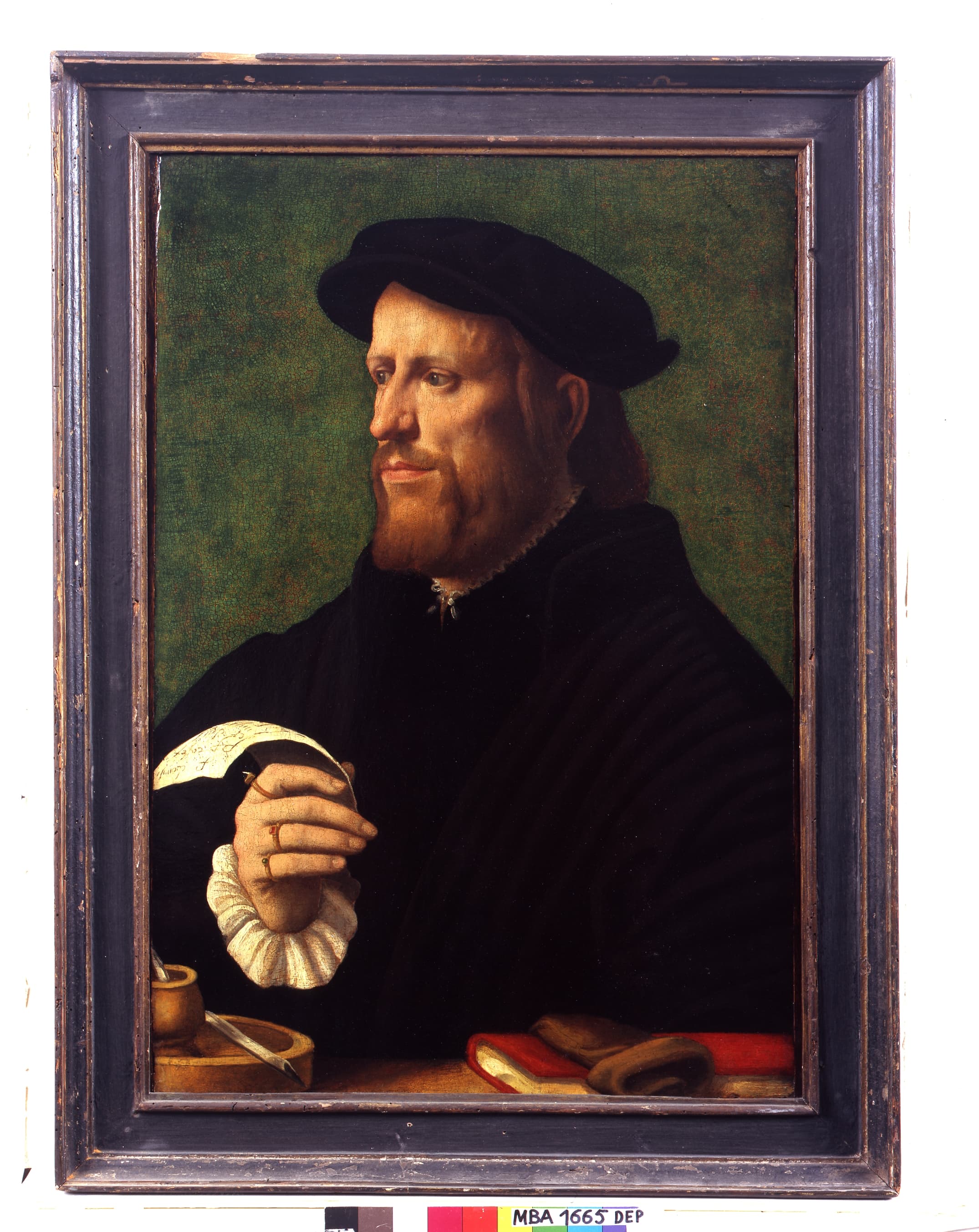 portrait d'inconnu (homme, de trois-quarts, à mi-corps, barbe, couvre-chef, main, écriture, lettre, encrier, livre, table)