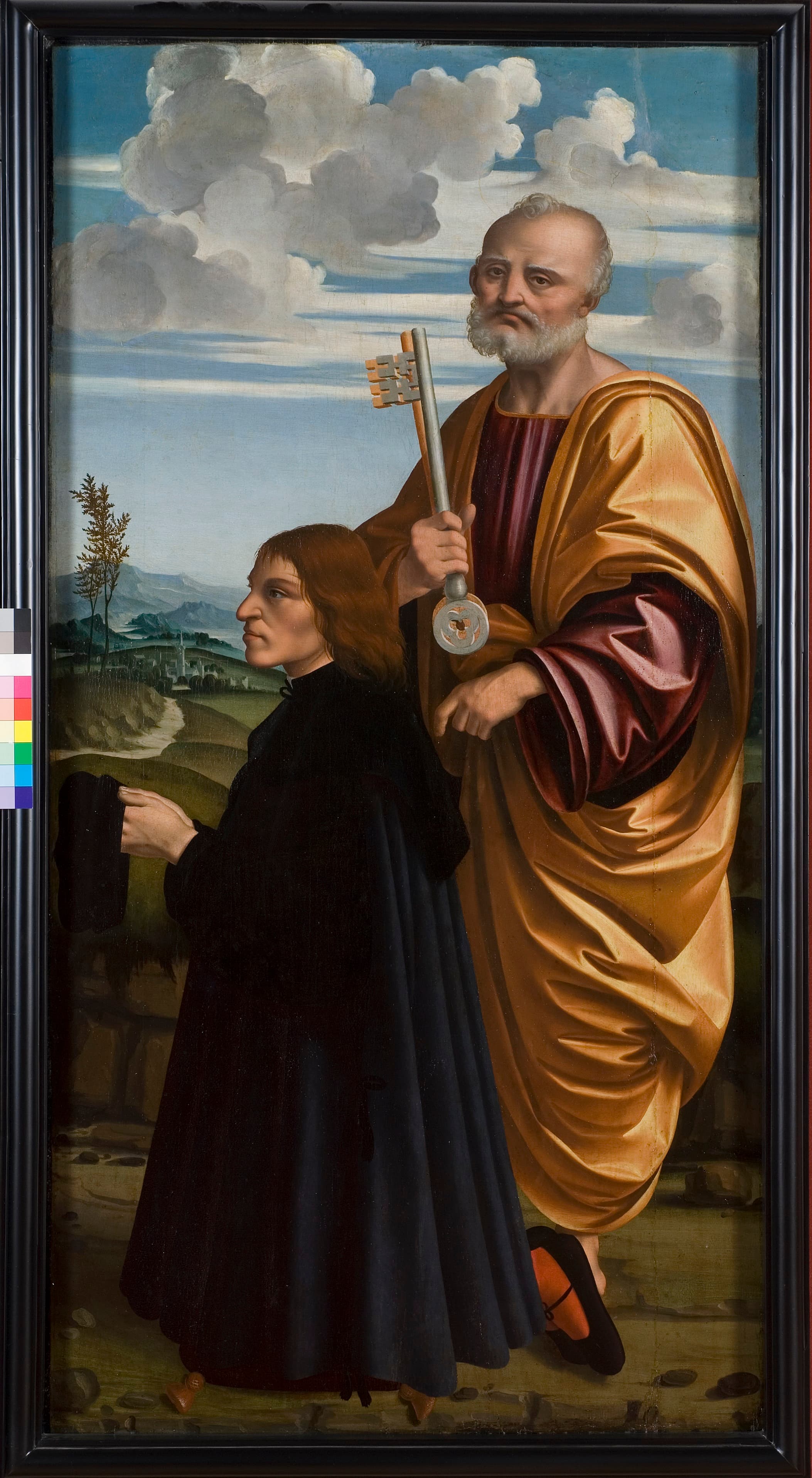 scène biblique (saint Pierre, debout, clé, vêtement, homme : en donateur, agenouillé, prière) ; fond de paysage