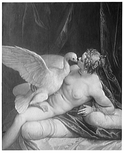 scène mythologique (Léda : nu, Jupiter, représenté en : cygne, métamorphose, amour, relation sexuelle, effet de tissu, draperie, coussin, bijou, coiffure)