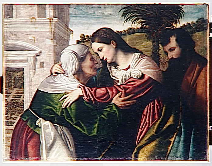 scène biblique (Visitation, saint Joseph, palmier) ; fond de paysage (demeure, jardin, décor de jardin)