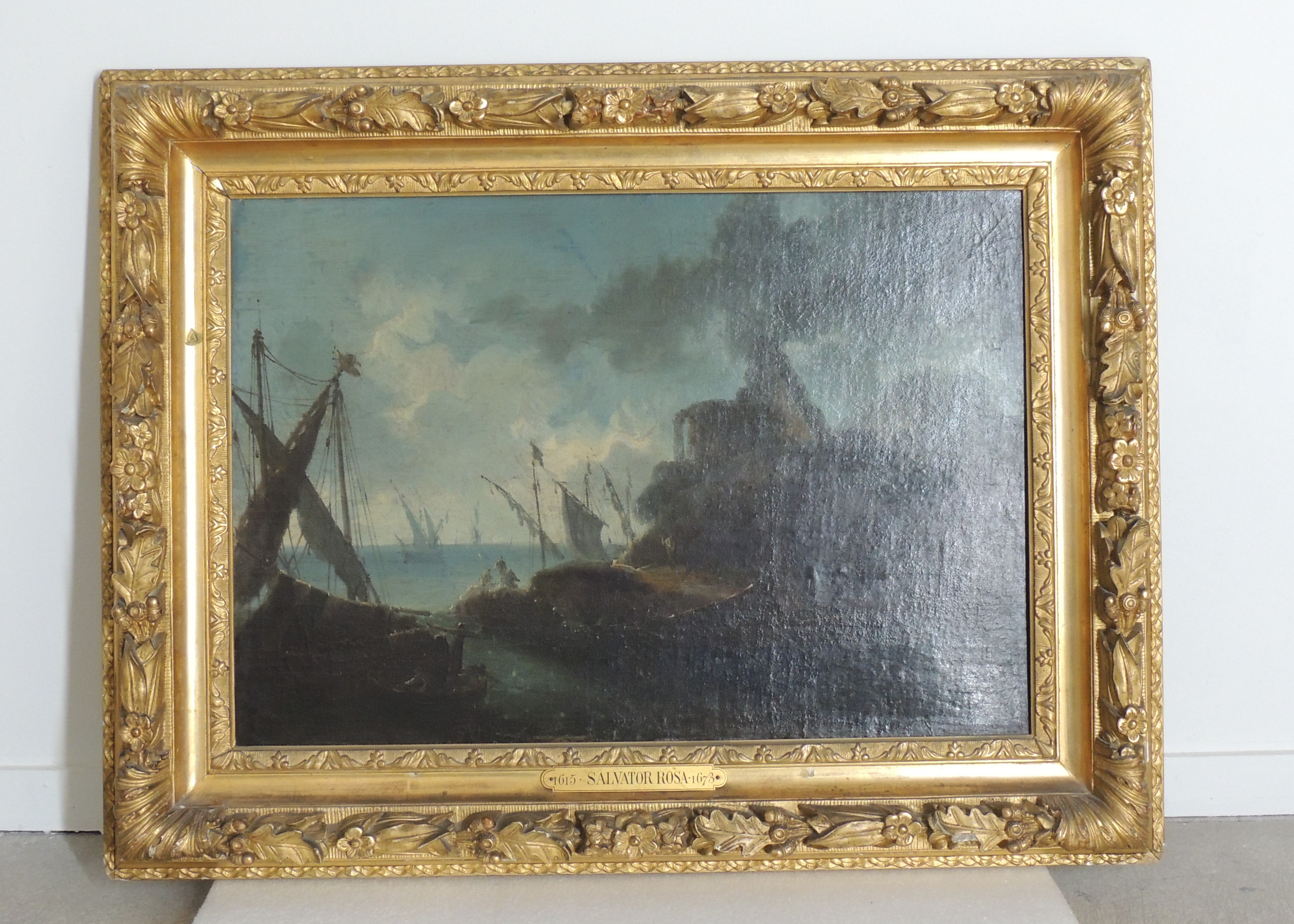 -Montant supérieur : Étiquette MNR ; étiquette ronde "It/55" ; étiquette Salzbourg ; à l'encre "...1693/École hollandaise/Van des Kabel" (?)