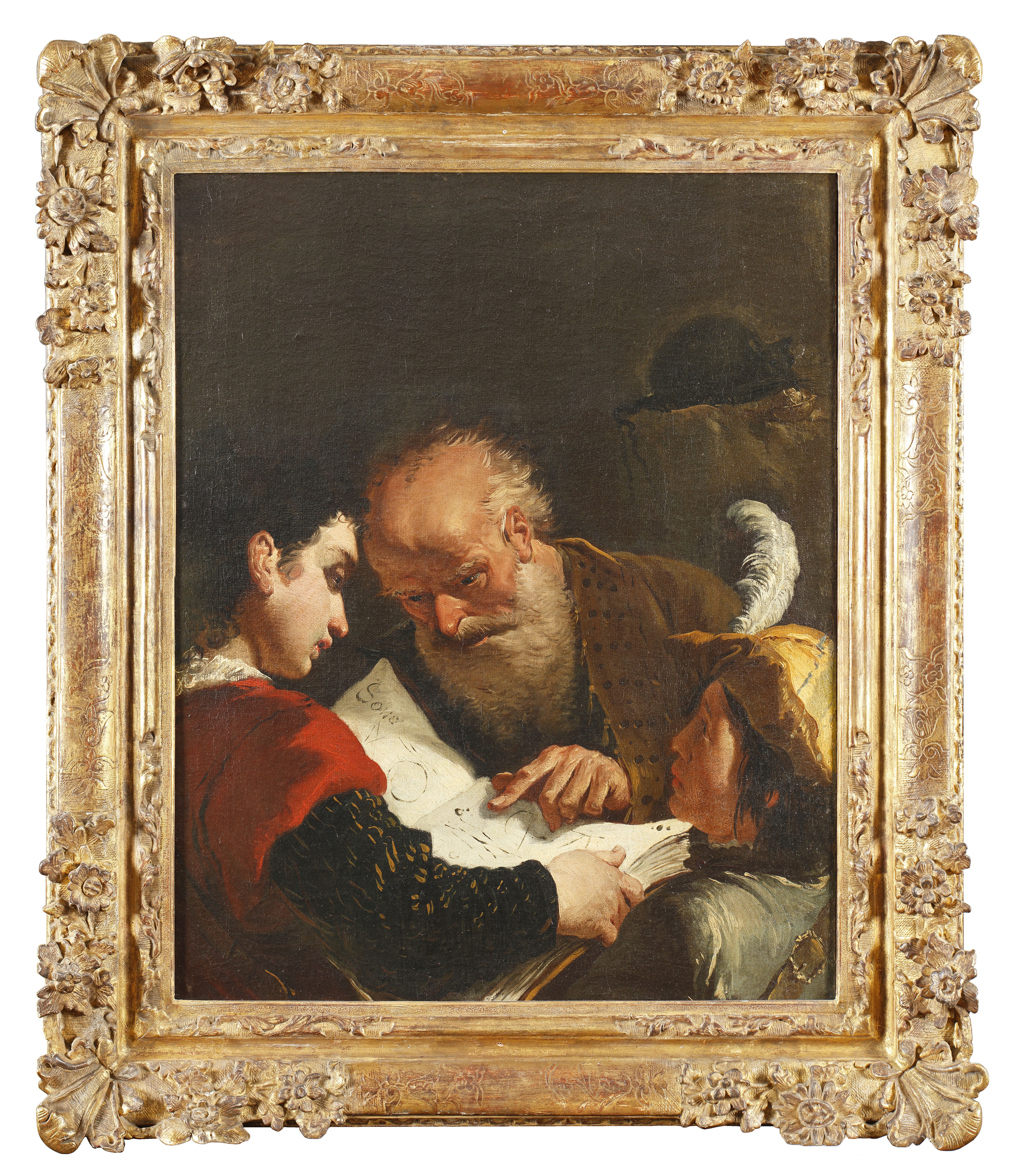 scène (vieux, enfant, enseignement, lecture, livre, couvre-chef, plume)