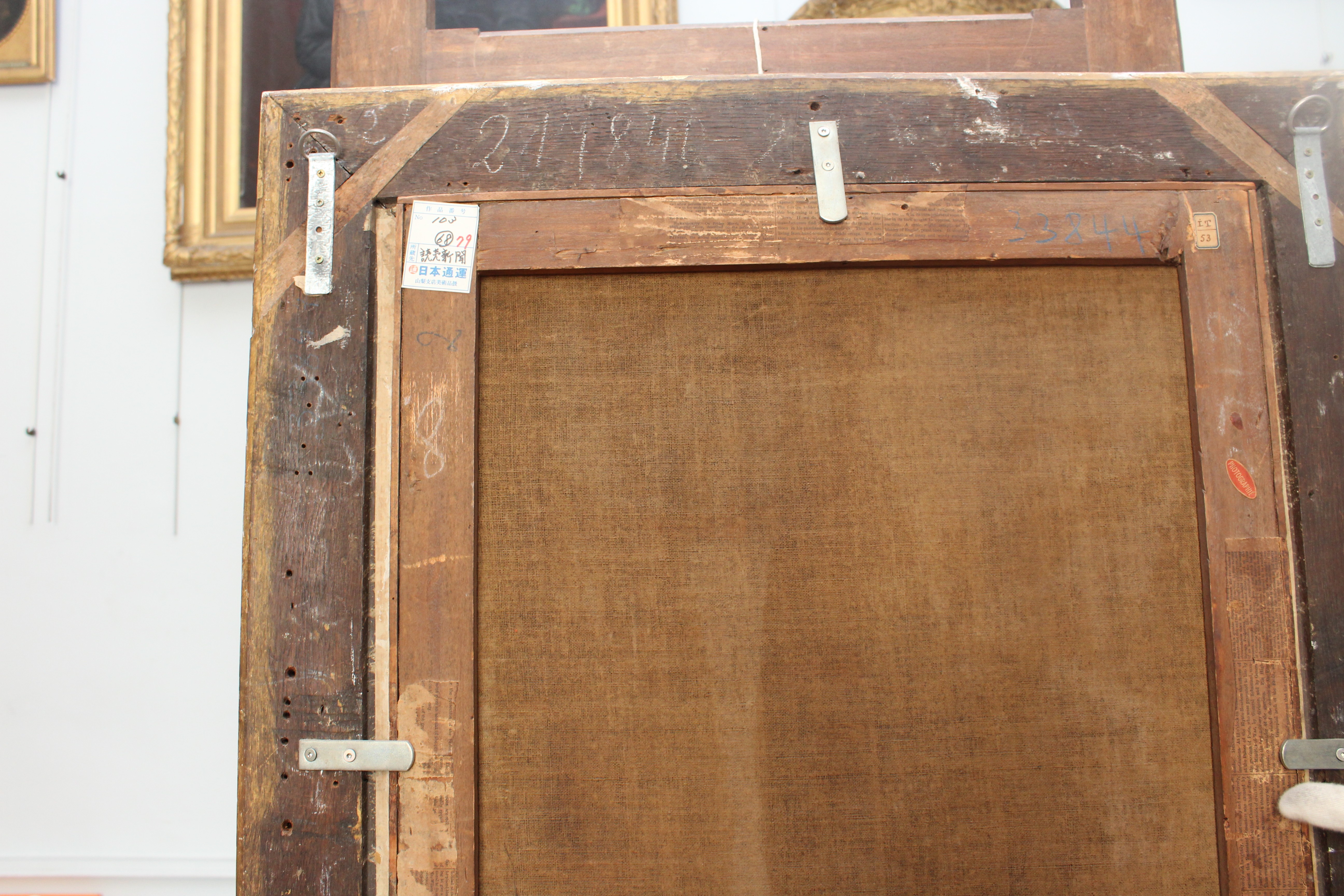 Sur le montant droit : A la craie blanche "814..." ; étiquette rectangulaire à coins coupés et listel bleu "IT/53" ; étiquette ovale rouge "Photographié" ; papier collé : journal en anglais.