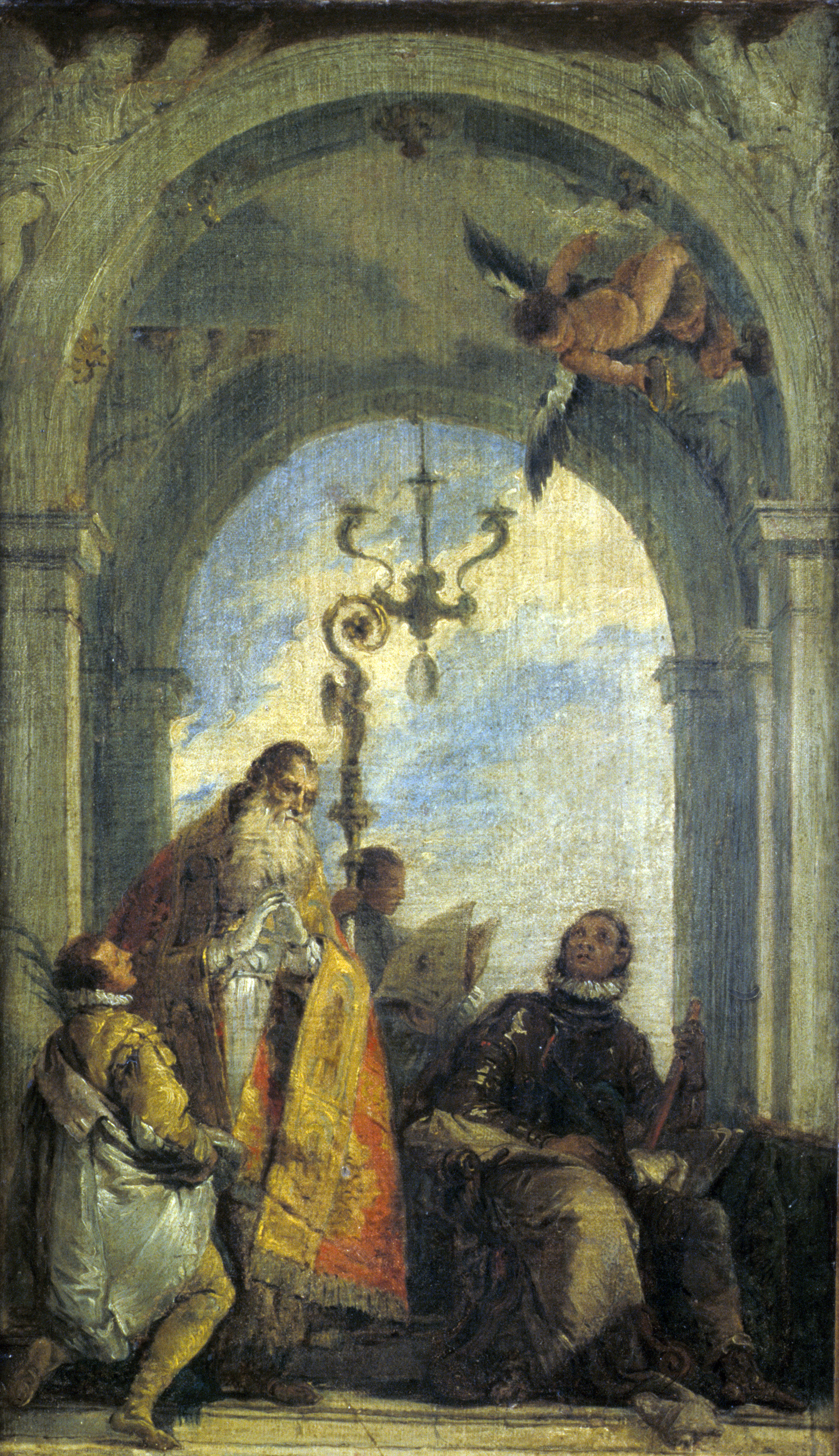 scène historique (saint Procule de Vérone, chape, saint Ferme de Vérone, saint Rustique, armure, assis, ange, couronne, serviteur, agenouillé, palme : martyre, crosse, mitre)