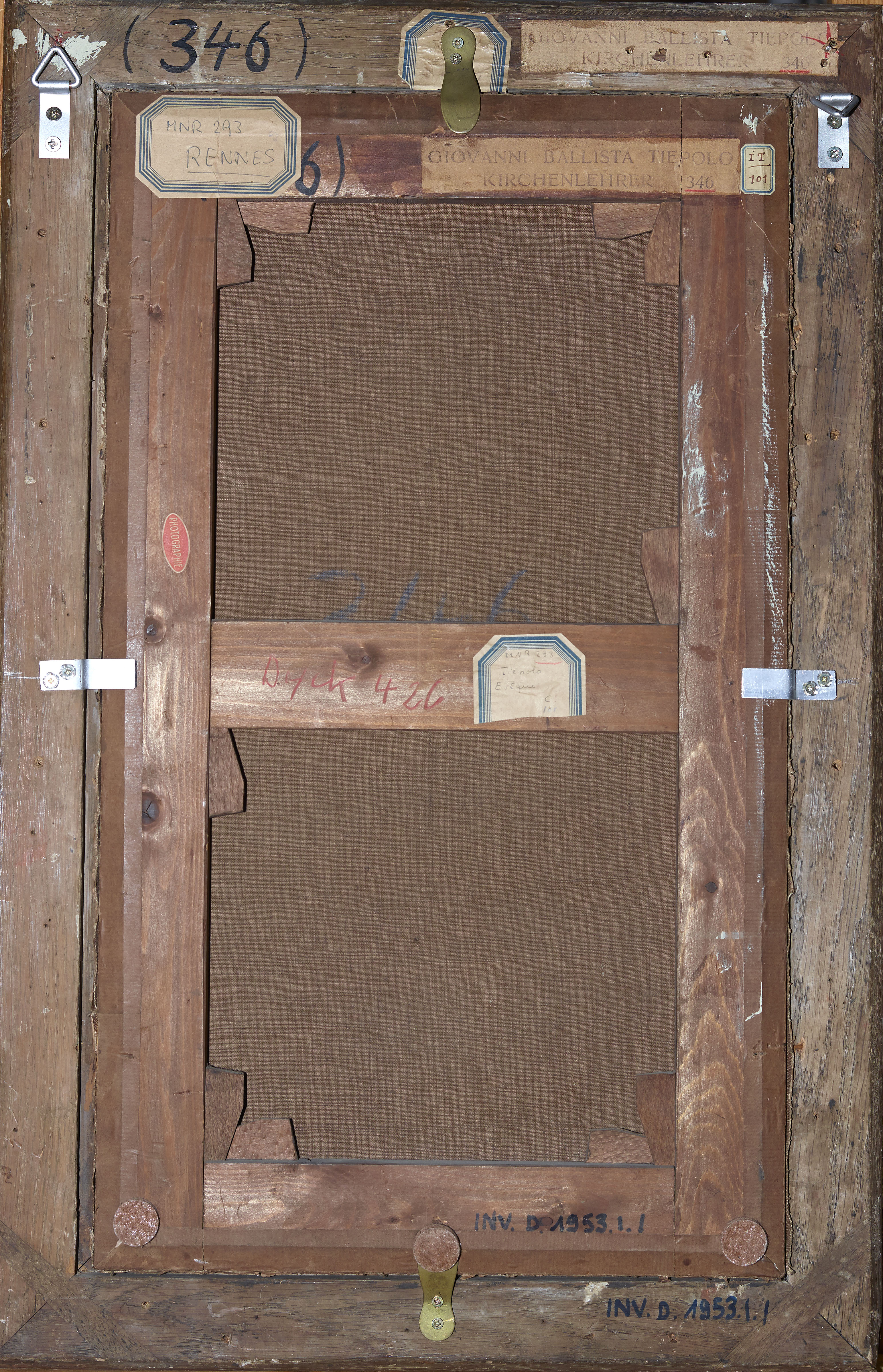 Sur la traverse médiane : « Dyck 426 » en rouge ; étiquette rectangulaire à pans coupés bordée de bleu « MNR 293/Tiepolo/Évêque/C./18° ».