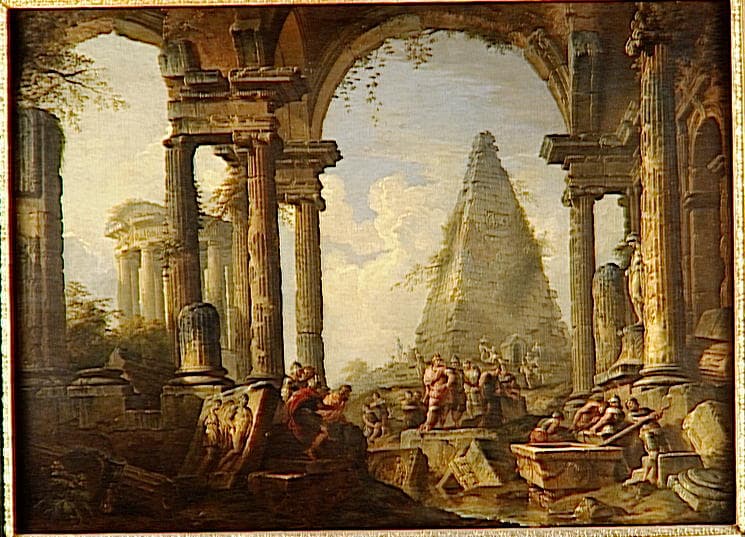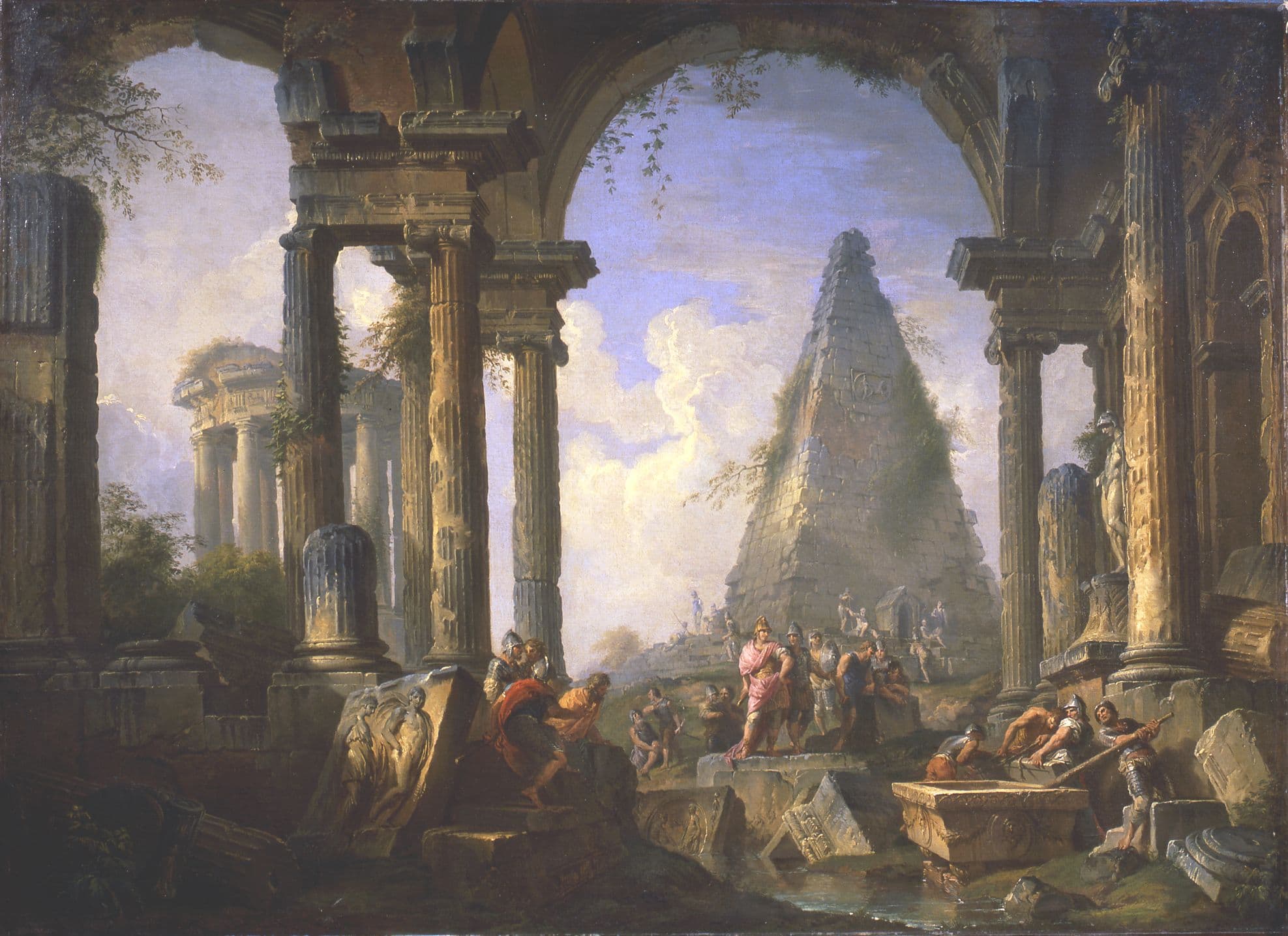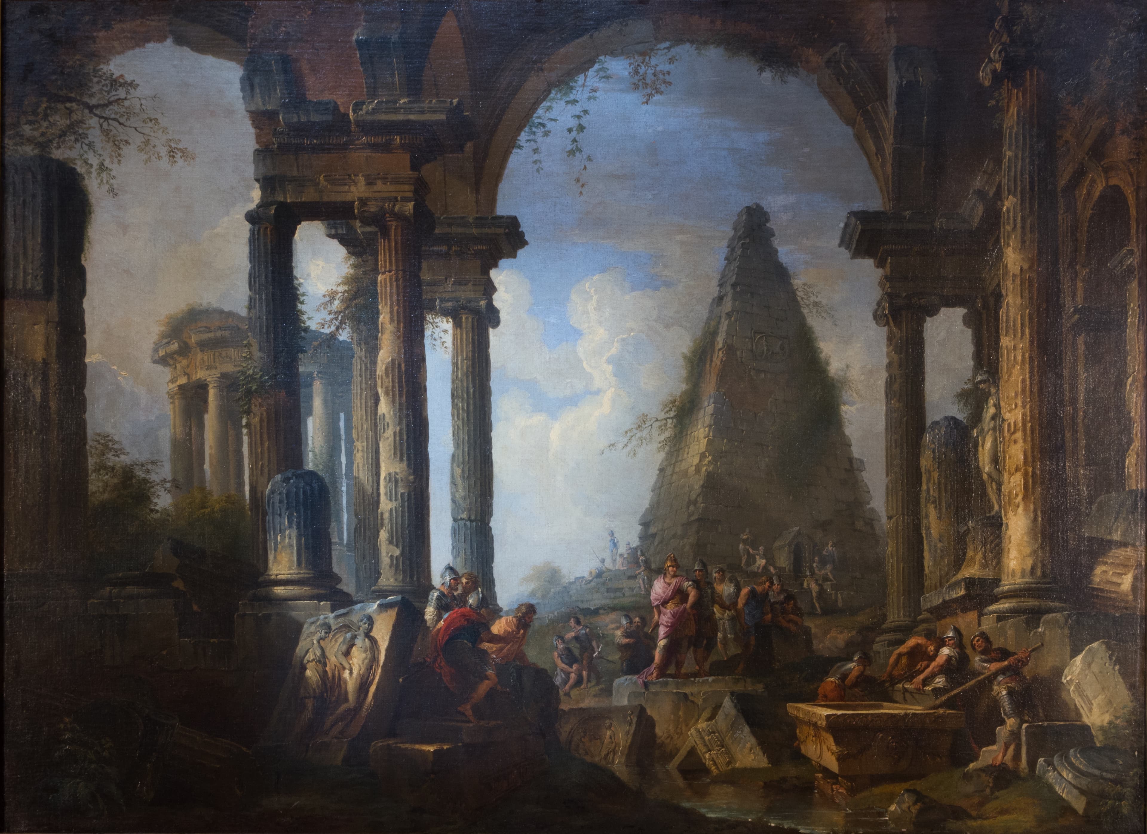 scène historique (Alexandre le Grand : chef militaire, pyramide, tombeau : Achille, soldat, personnage) ; vue d'architecture (ruines, colonne, arcade, stèle, statue, relief, temple, ?, végétation)