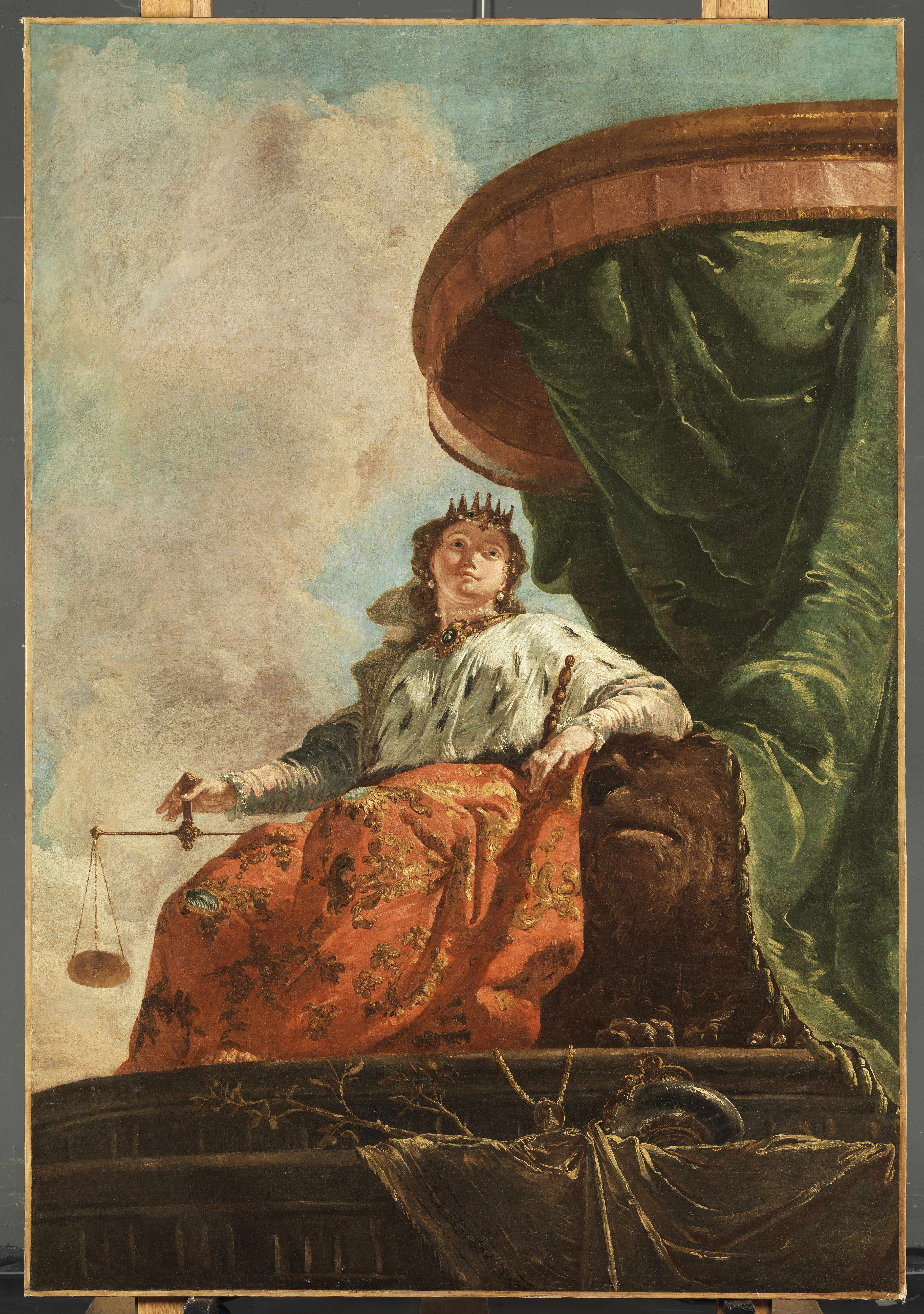 figure (allégorie, justice, femme, assis, trône : lion, attribut, balance, couronne, symbole : cité : Venise, tenture, socle)