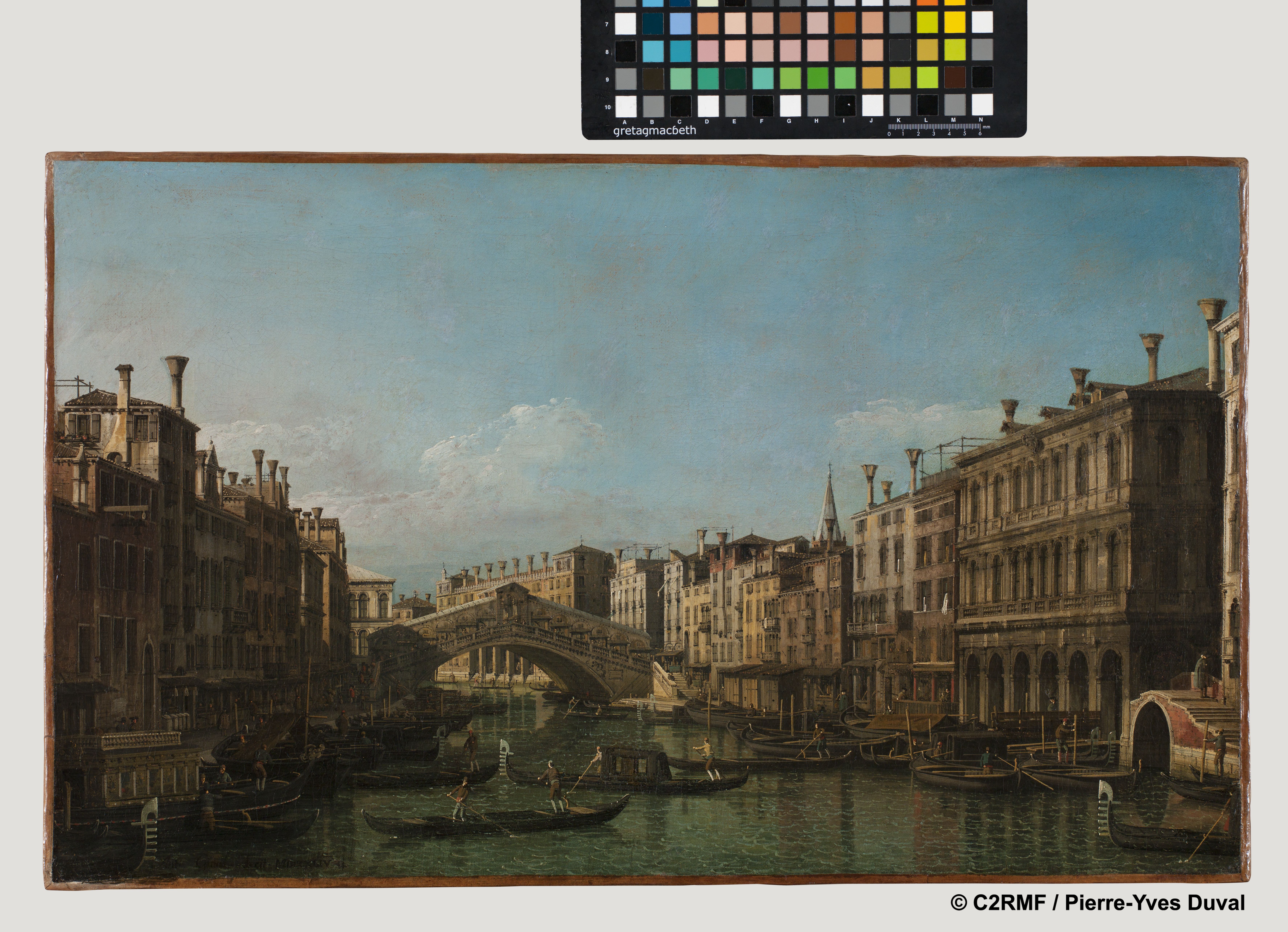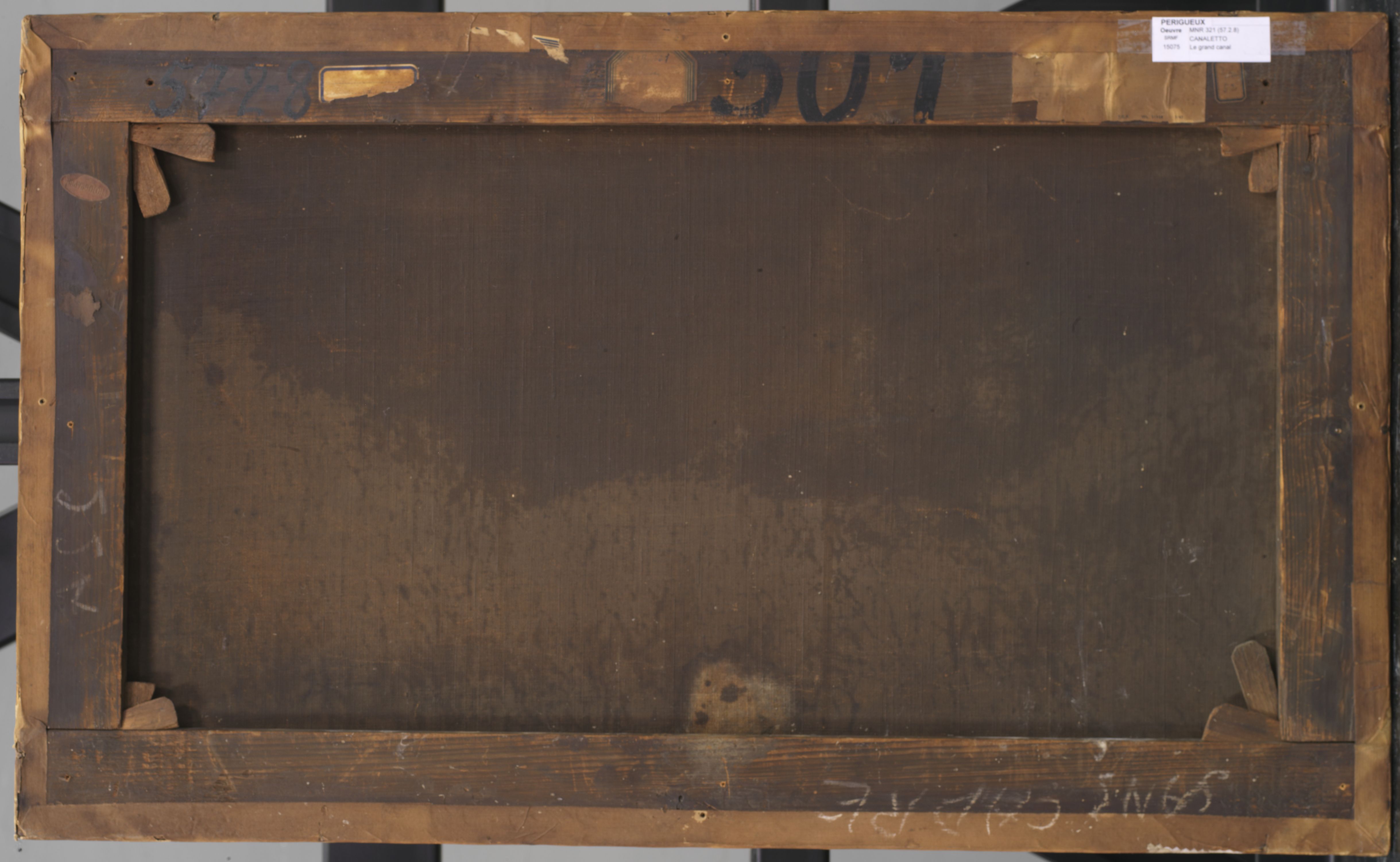 Sur le montant supérieur : Au pinceau noir "301" ; en noir (?) "57-2-8" ; à l'encre de chine "TG. P. Wt 51958 3/43" ; étiquette blanche à bordure bleue "Inv. 57.2.8" ; étiquette rectangulaire à listel bleu "MNR 321/Canaletto/Le pont Rialto" ; étiquette rectangulaire illisible ; étiquette rectangulaire à coins coupés et listel bleu "IT/52".
