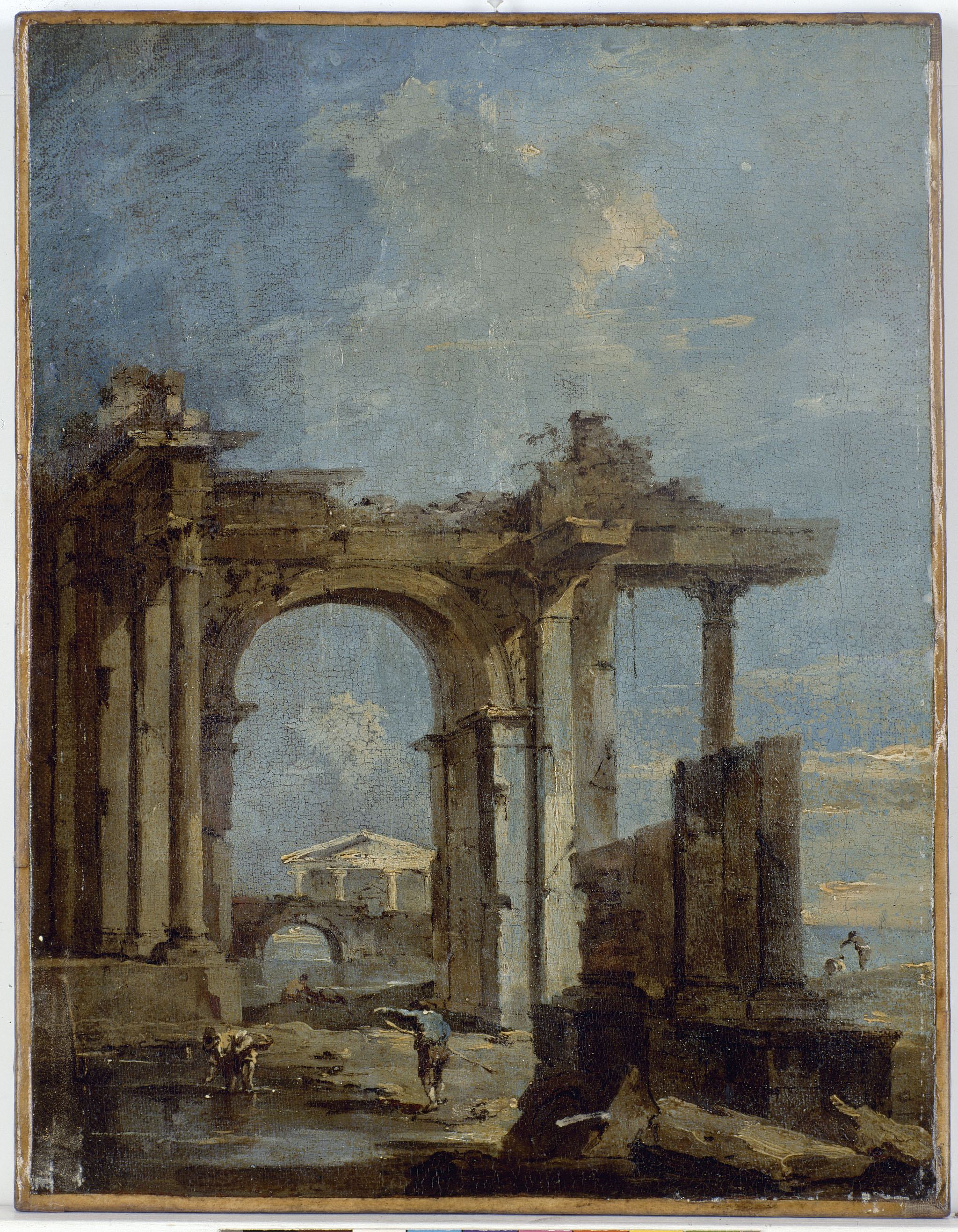 Sur le montant supérieur : A gauche, étiquette rectangulaire « Tel. 330240435960 -Atlantic Fine Art .../Œuvre : Caprice avec arc en ruines/Prêteur MBA Rennes/ Réf. D.1953.2.1/2 rue du Bois de Barre-44100 NANTES » ; étiquette rectangulaire à pans coupés bordée de bleu coupée : « ... Guardi/Ruines/Arcades/107 » ; en bleu « ...319 » ; étiquette rectangulaire bordée de bleu « IT (souligné)/103 ».