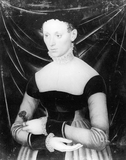 portrait d'inconnu (femme, à mi-corps, de trois-quarts, robe, col, coiffure, bras : croisé, oeillet, draperie)