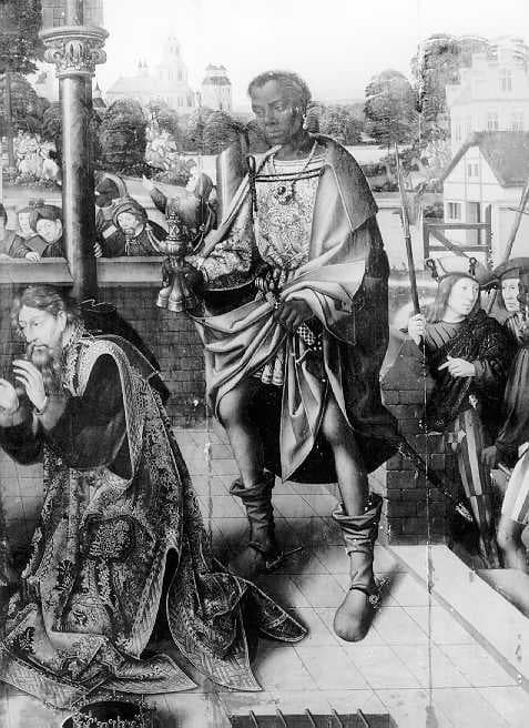 scène biblique (Adoration des Mages, offrande, richesse) ; fond de paysage (élément d'architecture, foule, arbre, pré, maison)