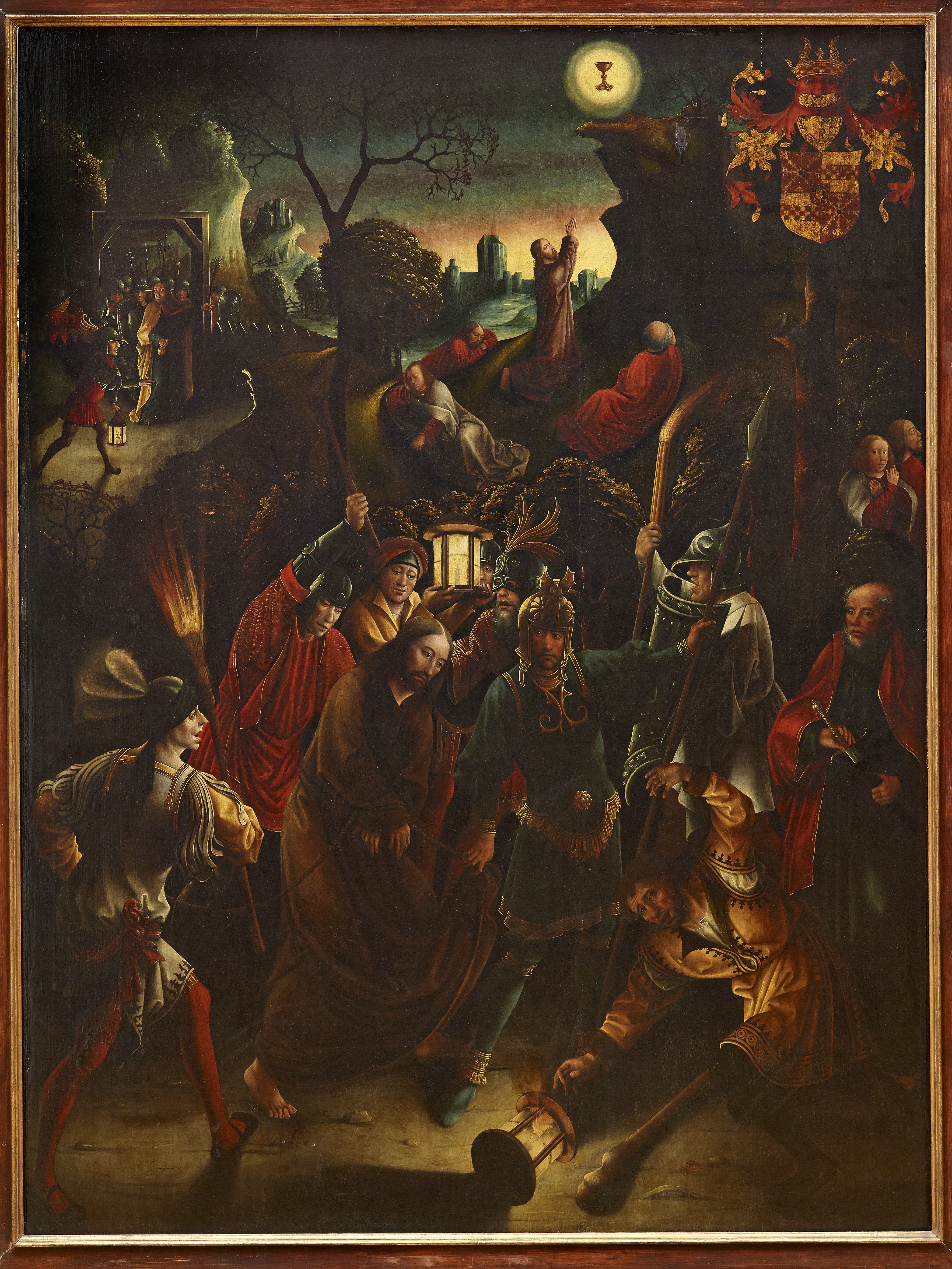 scène biblique (Jardin des oliviers, prière, apôtre : sommeil) ; scène biblique (Arrestation du Christ, saint Pierre, violence) ; fond de paysage (arbre, rocher, personnage, rempart)