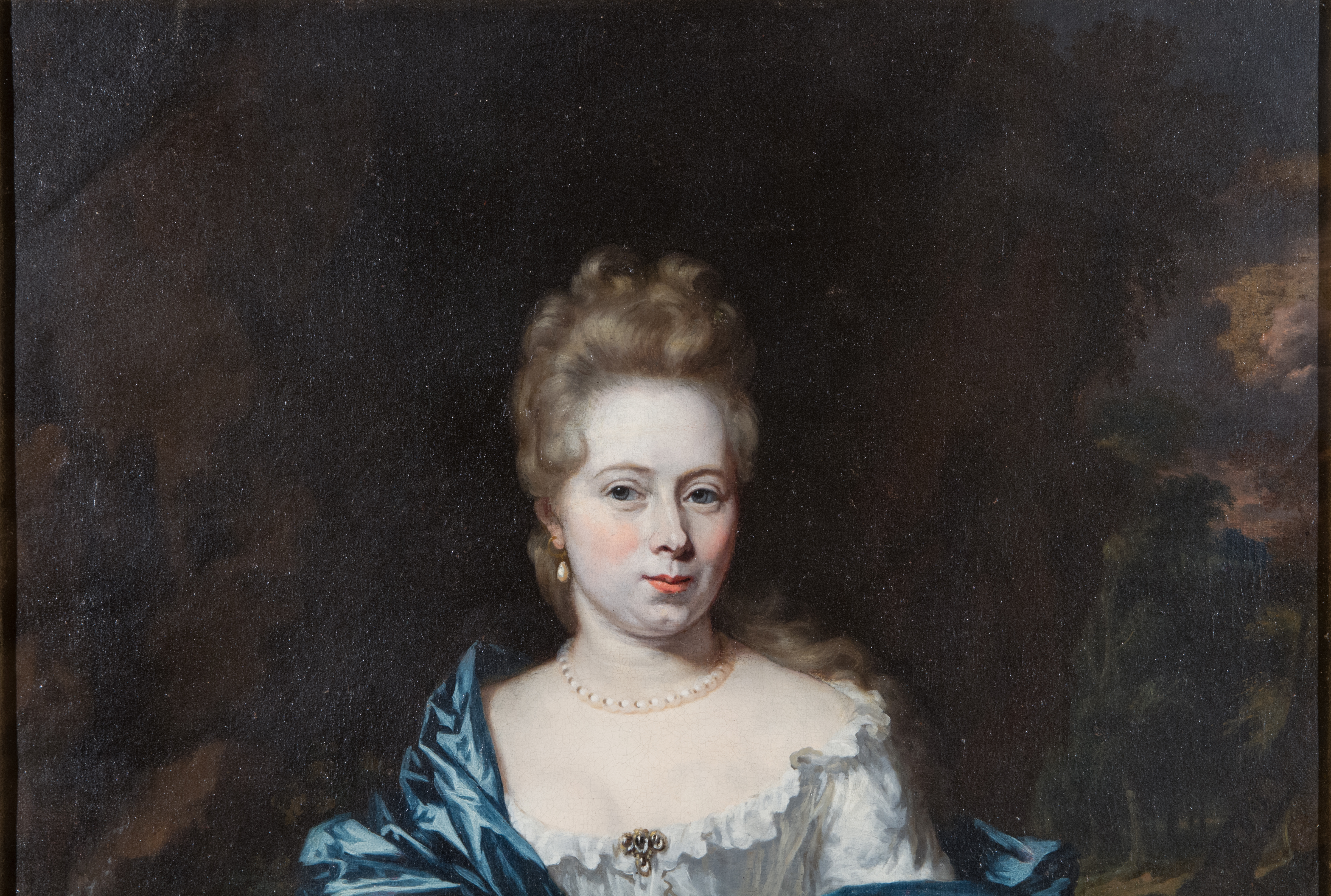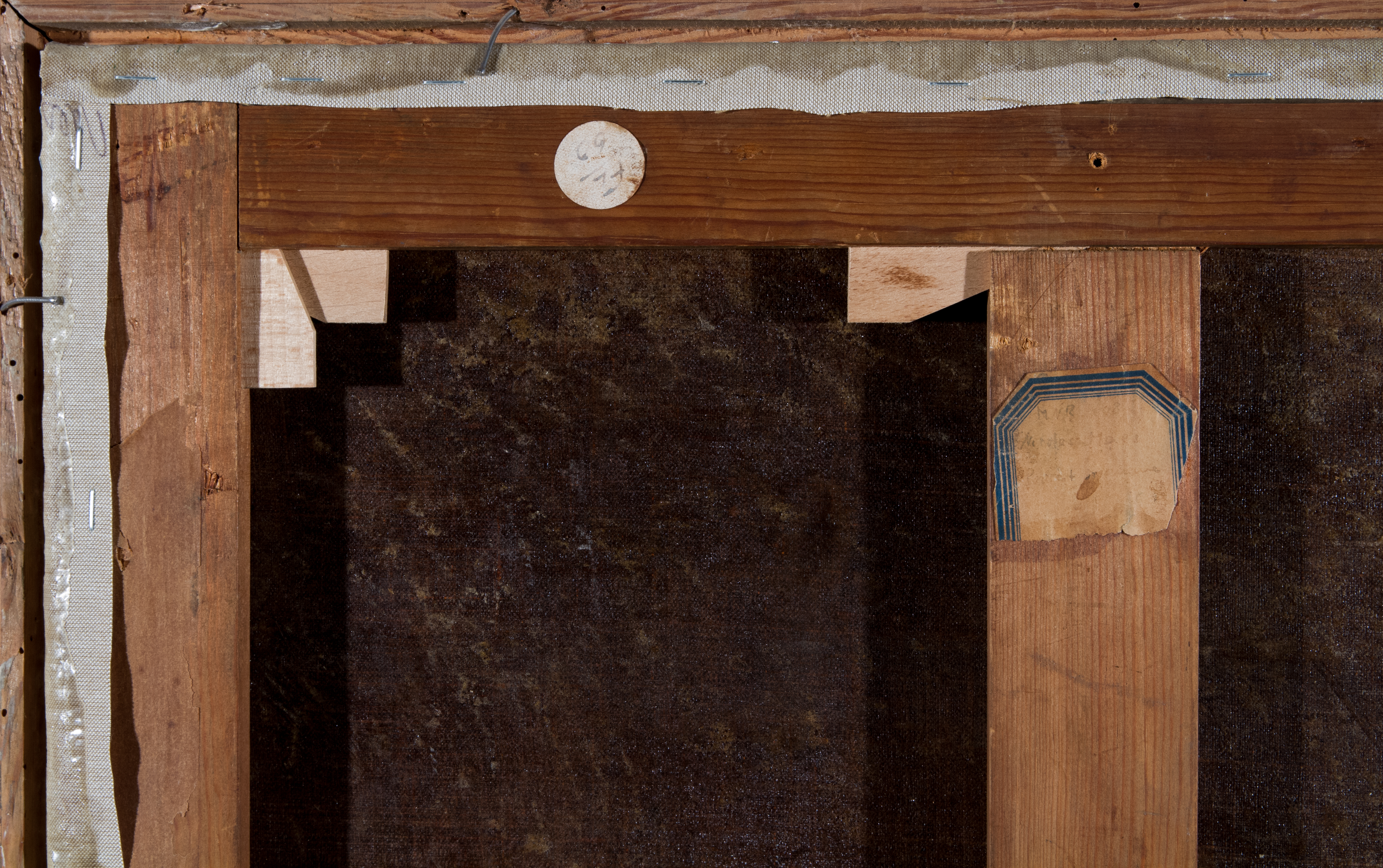 -Traverse verticale : Demi-étiquette rectangulaire à coins coupés et listel bleu "MNR 408/Nicolas Maes/Portrait de femme".