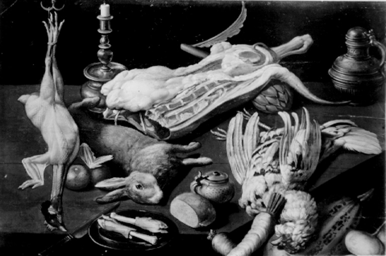 nature morte (gibier à plume, lapin, viande, pain, vaisselle, couteau, artichaut, légume, chandelle, table)