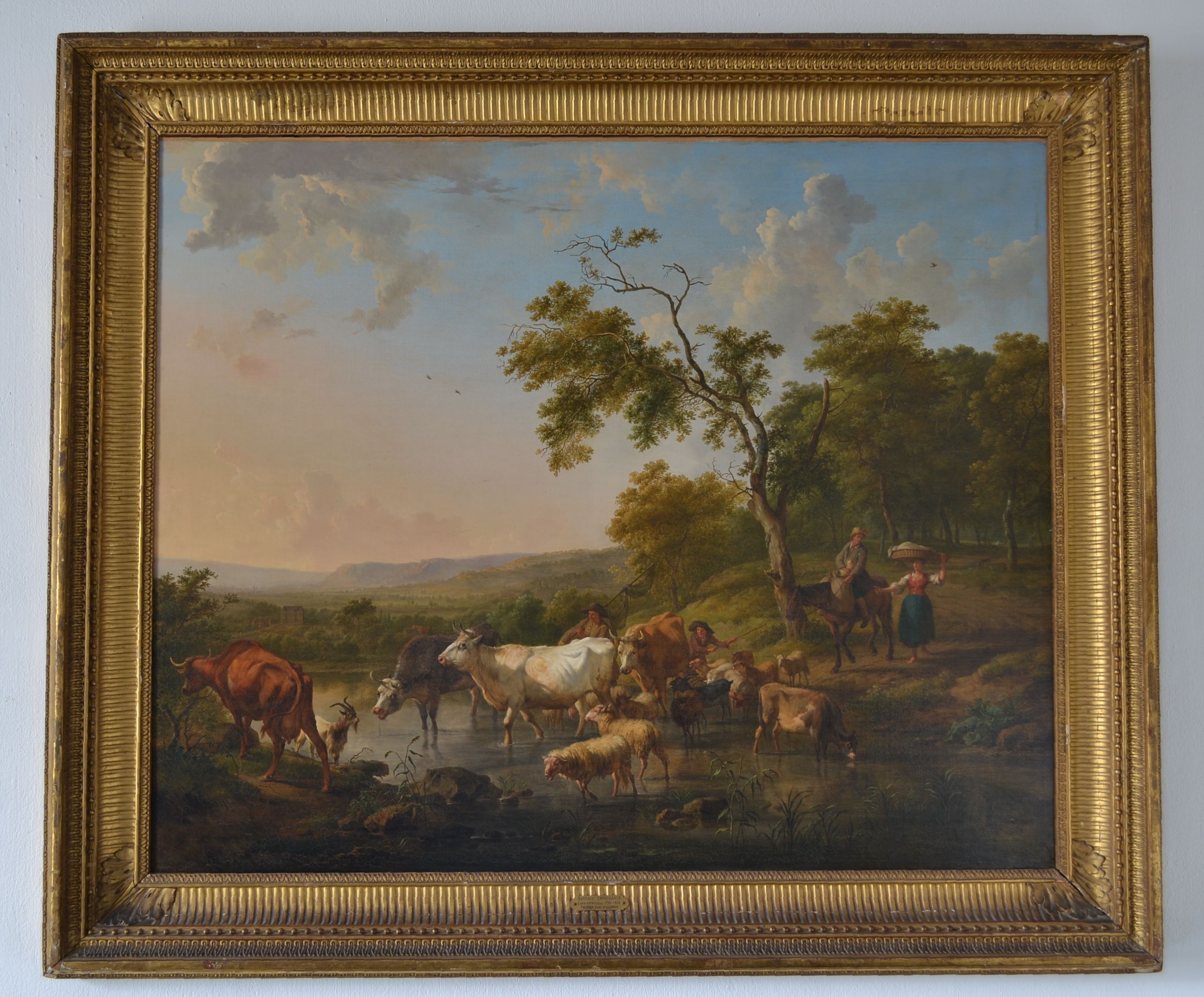 -Montant supérieur : Étiquette rectangulaire à coins ronds « NP Réf.NP P0604-Ext.57 » ; au crayon bleu « Troti [sic] Krefeld N° L959 » ; étiquette rectangulaire dentelée liseré de bleu « MNR 513/Omegank/Paysage avec/troupeau » ; étiquette rectangulaire « Balth. Ommeganck, Herde i.d. Furt/Gem. Verz. 274 » et rajouté à la main « Tableau à/la Restauration/chez Guilly/porté ce ...425 » ; étiquette ronde liseré bleu « Ho/96 ».