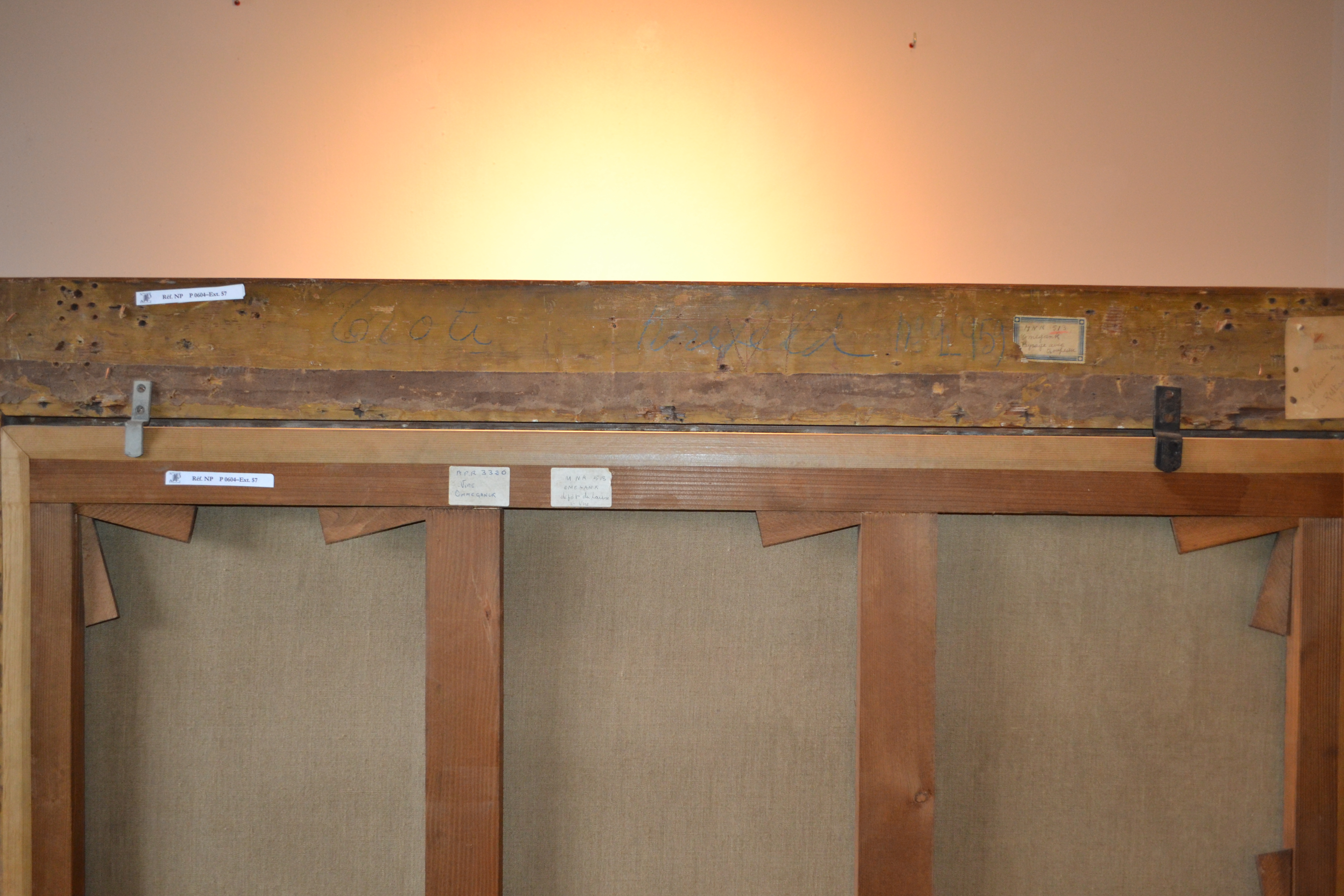 -Montant supérieur : Étiquette rectangulaire à coins ronds « NP.Réf. NP P0604-Ext. 57 » ; étiquette rectangulaire à coins ronds « MPR3320/Vire/Ommeganck » ; étiquette rectangulaire à coins ronds « MNR 513/Ommegank [sic]/dépôt du Louvre/Vire ».