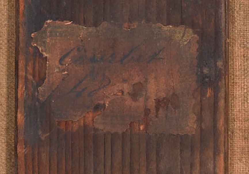 -Montant supérieur : Étiquette rectangulaire : « Gustave Courbet/1819-1877/Biche morte/Chevreuil mort/(en rouge) F21 (...) »