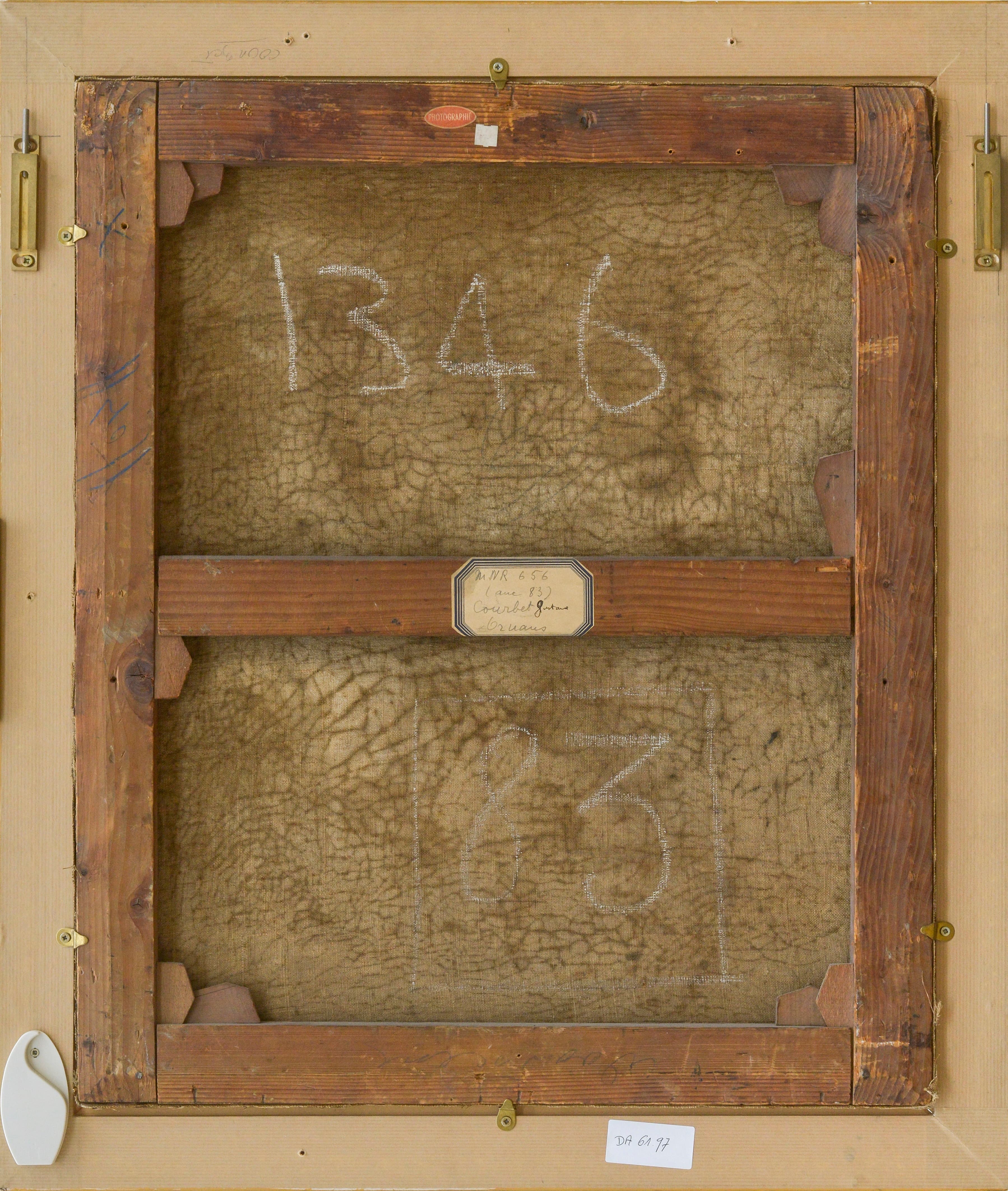 -Traverse médiane : Étiquette rectangulaire à coins coupés et listel bleu « MNR 656/(anc. 83)/Courbet Gustave/Ornans ».