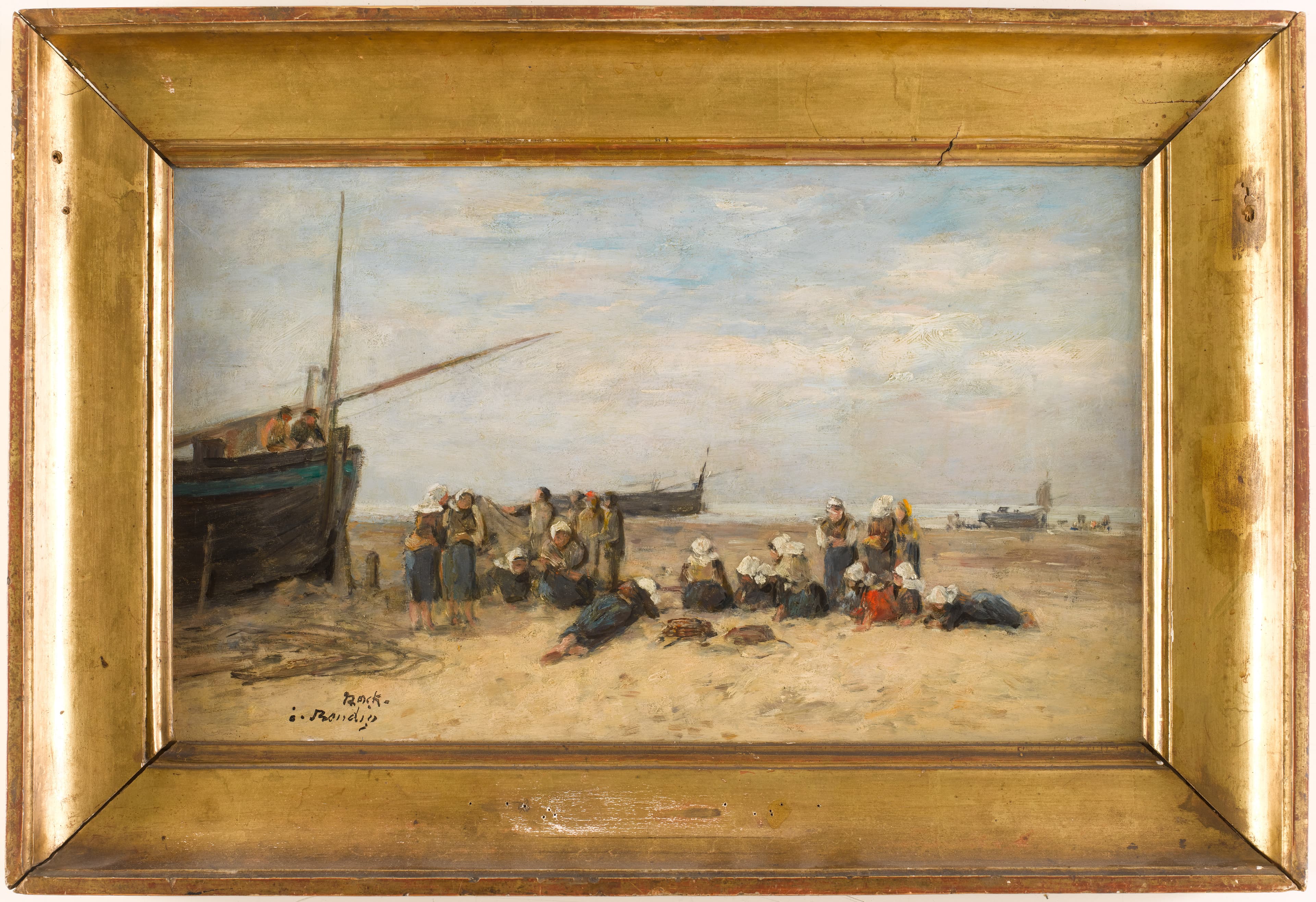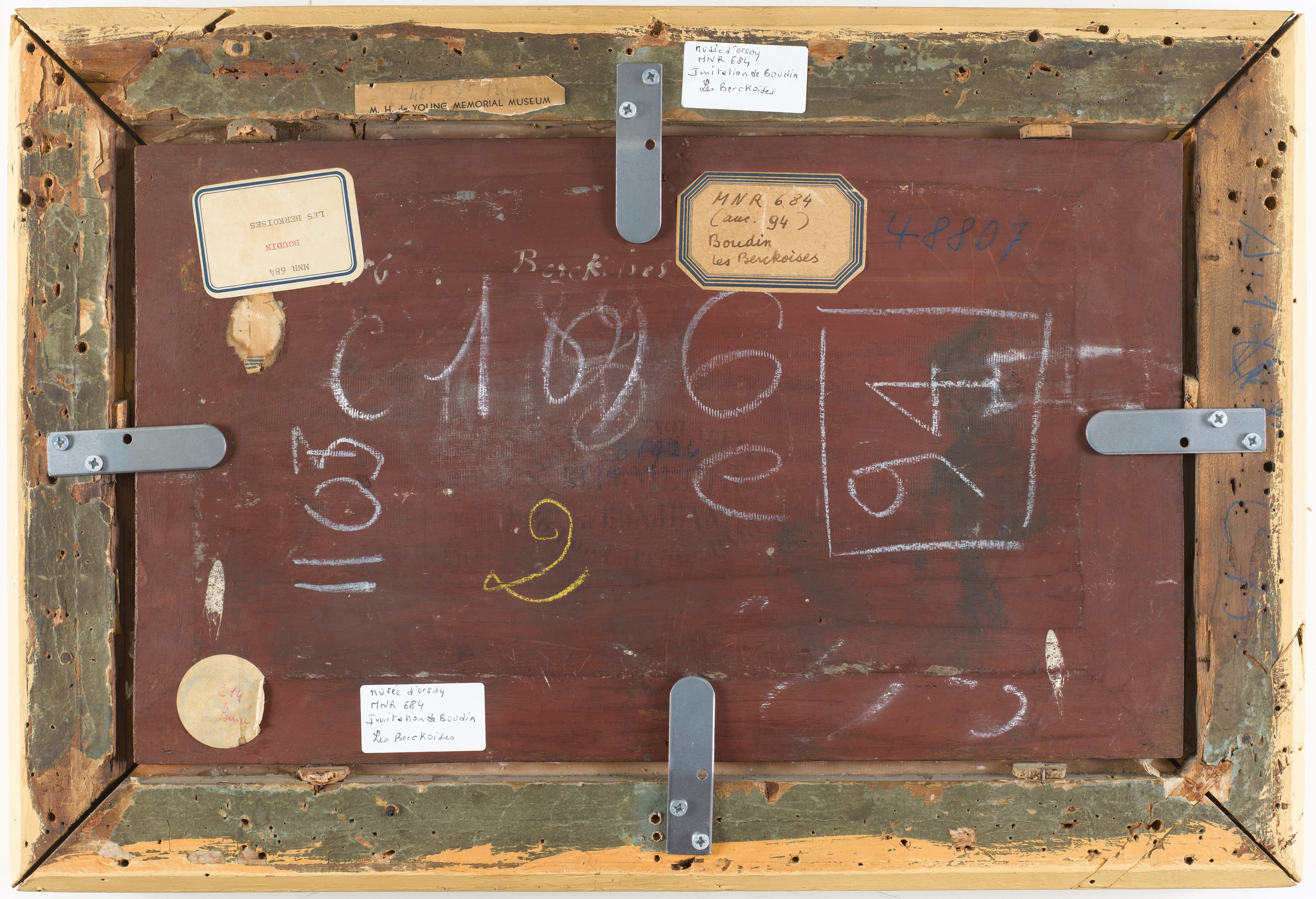 Sur le cadre : Étiquette fragmentaire (passait sur le panneau) : « M.H/ de YOUNG MEMORIAL MUSEUM ... » (NDLR : de San Francisco) et inscription postérieure au crayon « 46,5 27,5 toile » ; étiquette rectangulaire à coins arrondis « Musée d'Orsay/MNR 684/Imitation de Boudin/Les Berkoises » ; à la craie bleue « C15 » et « S1C8 ».