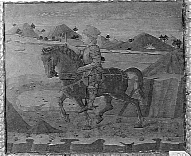 -Sur le panneau : A la craie blanche "479" ; "189" ; au crayon "B" ; étiquette rectangulaire à coins coupés et listel bleu "MNR 761/anc. 189/ École italienne XVe/Enfant cavalier"; étiquette à listel bleu "303/ 2 cassone".