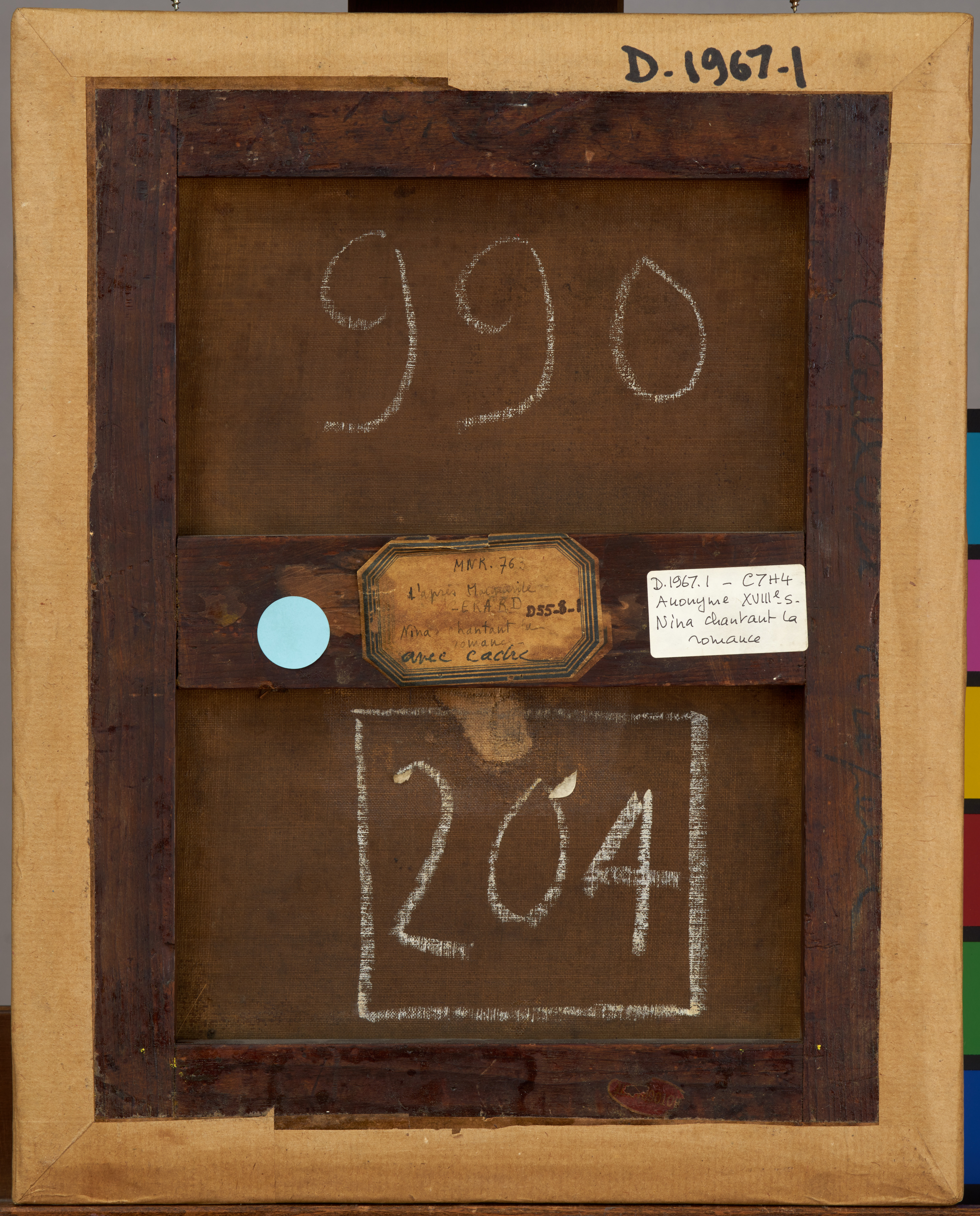 Sur le châssis : Au crayon bleu "Cailleux nuferc (?)", caché par papier de bordage ; étiquette rectangulaire à coins coupés et listel bleu "MNR 763/d'après Marguerite/GÉRARD/Nina chantant la/romance/avec cadre" et ajout "D 1967-1".