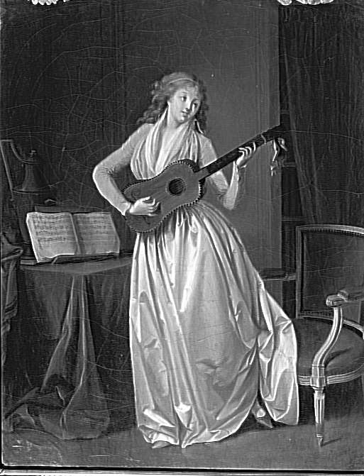 scène (jeune fille, musique, guitare, fauteuil, partition, intérieur)