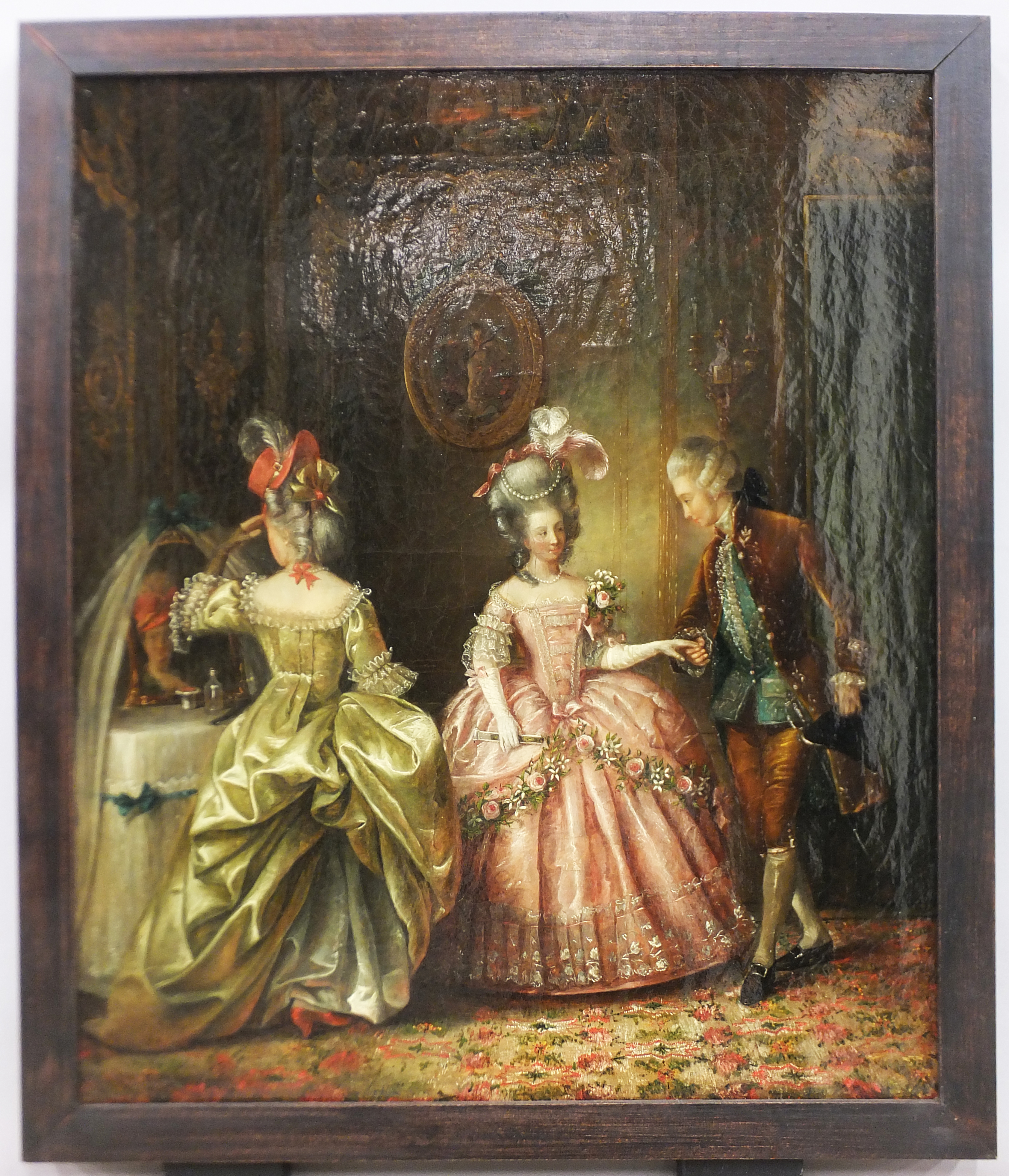 scène (femme, robe : bal, coiffure, homme, révérence, intérieur, meuble : maquillage, miroir)