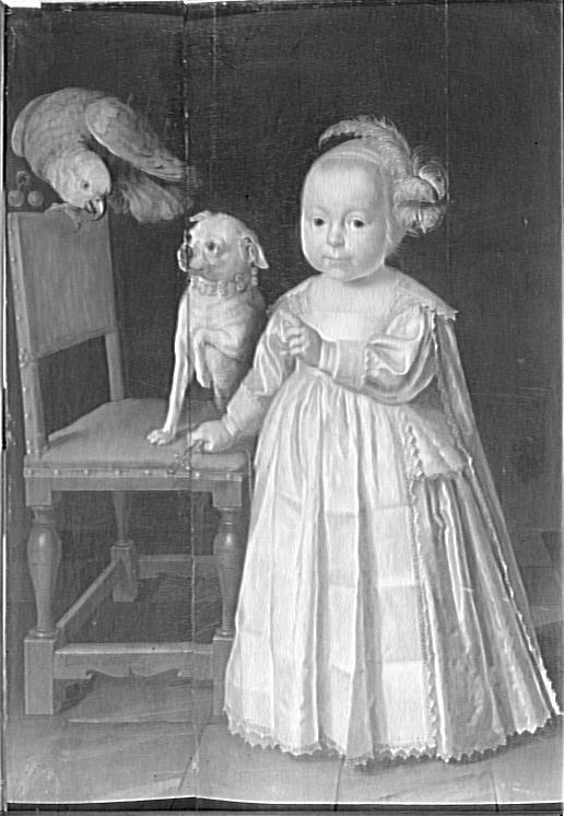 portrait d'inconnu (fillette, robe, debout, chaise, chien, perroquet, agression animale)