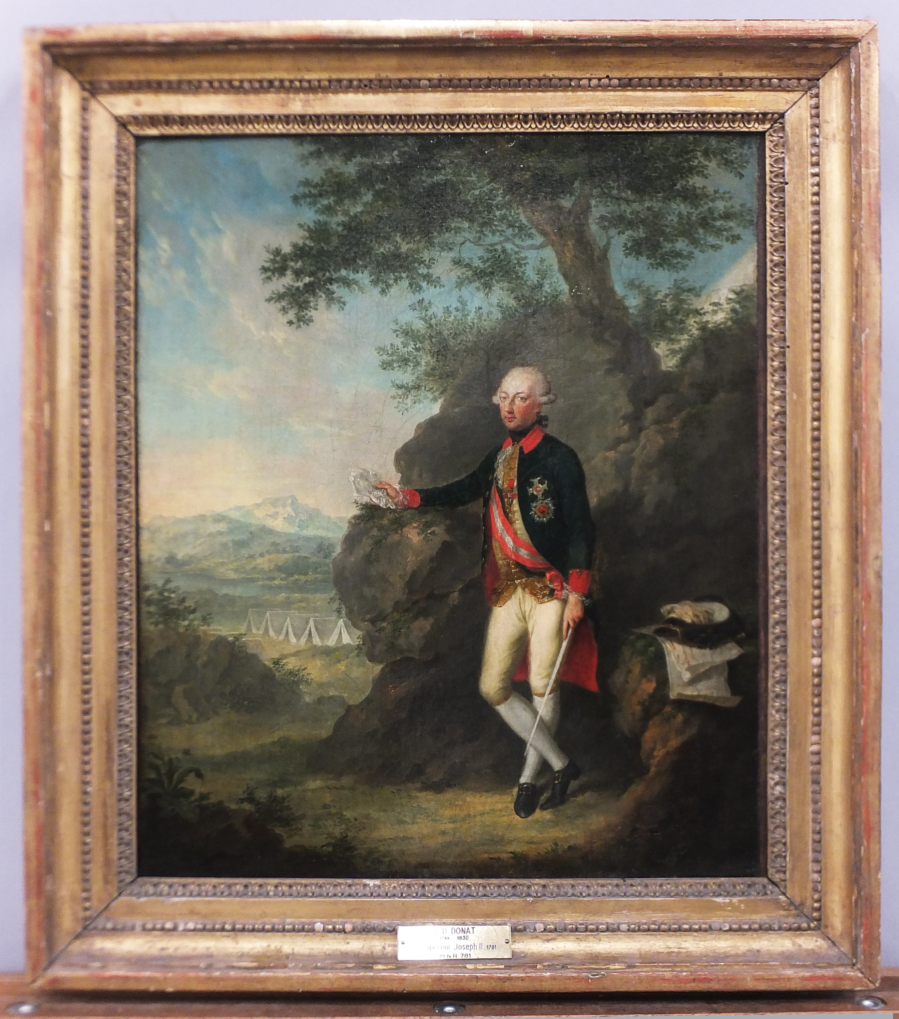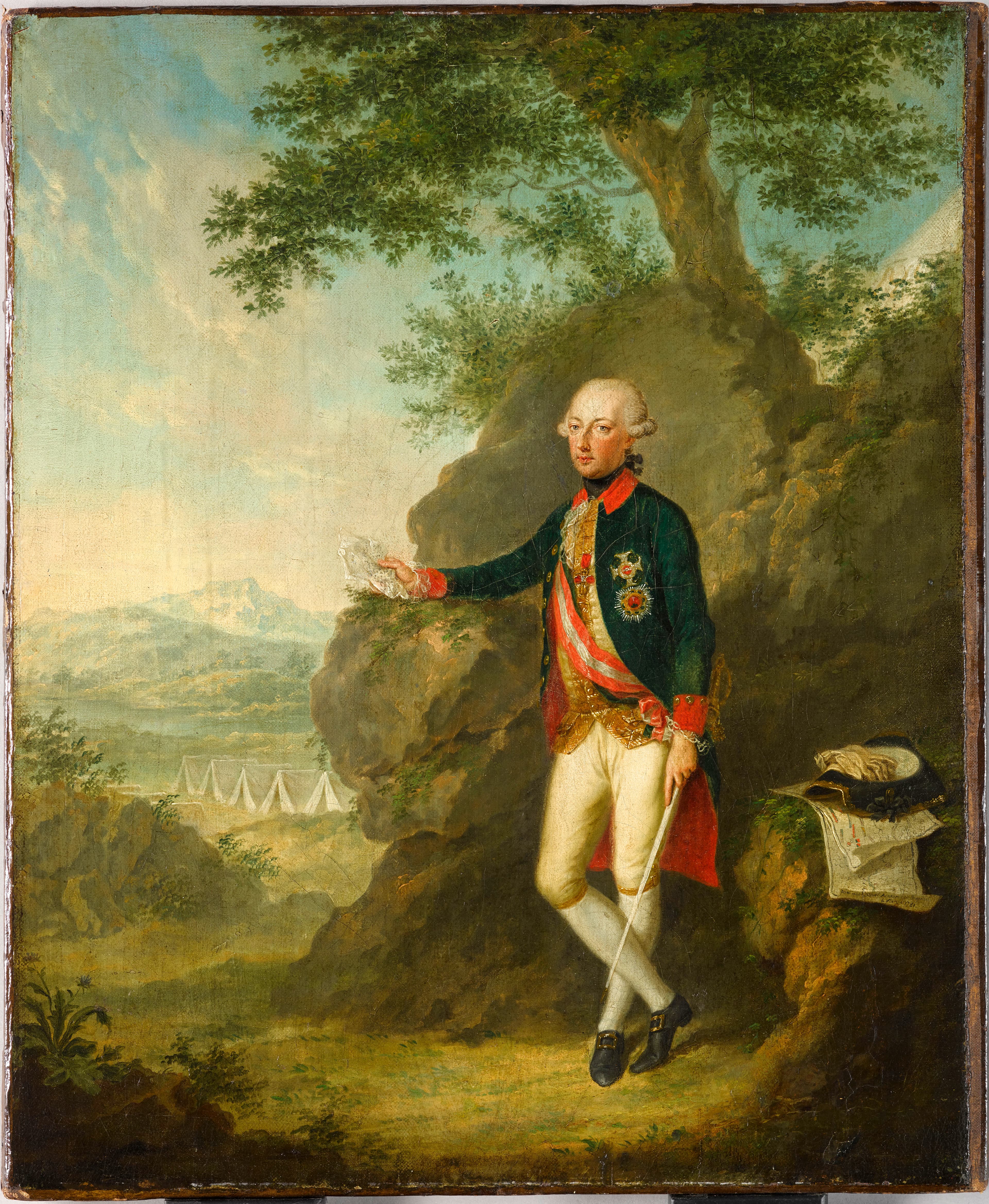portrait (Joseph II d'Allemagne, en pied, décoration) ; fond de paysage (plateau, rocher, feuillu, vallée, tente)