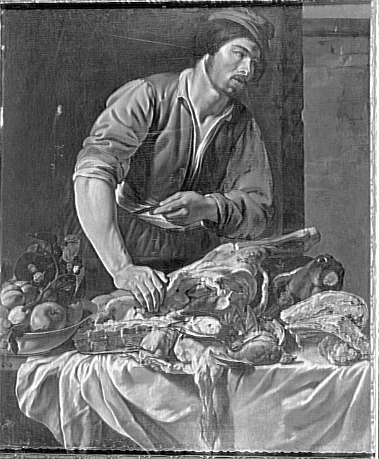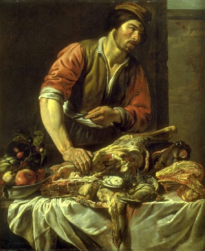 scène (boucher, échoppe, préparation des aliments : viande, gibier à plume, fruit, couteau)