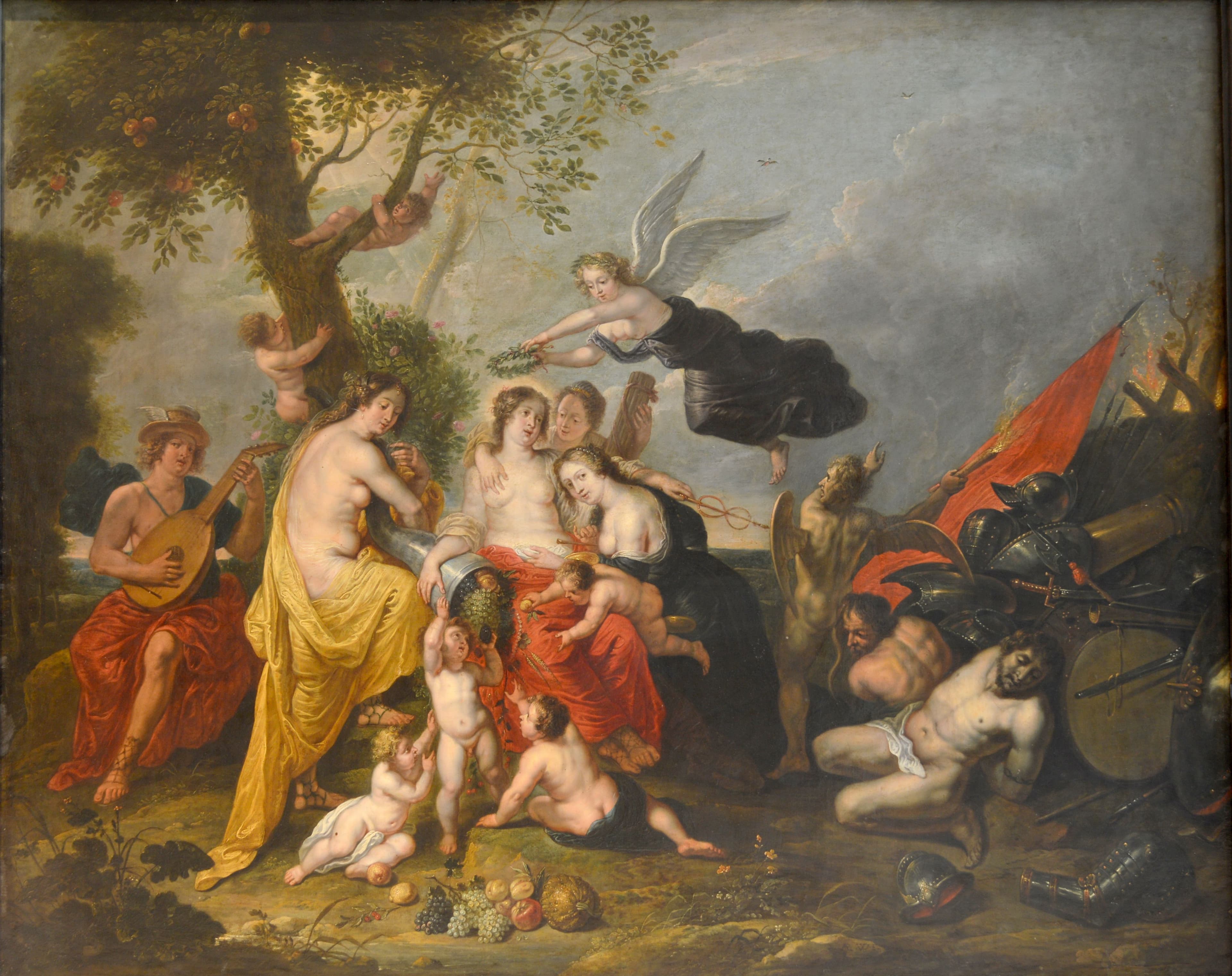 scène (allégorie : paix, couronnement, putti, Mercure, musique, fruit, captif, symbole : guerre, armure) ; fond de paysage (feuillu)