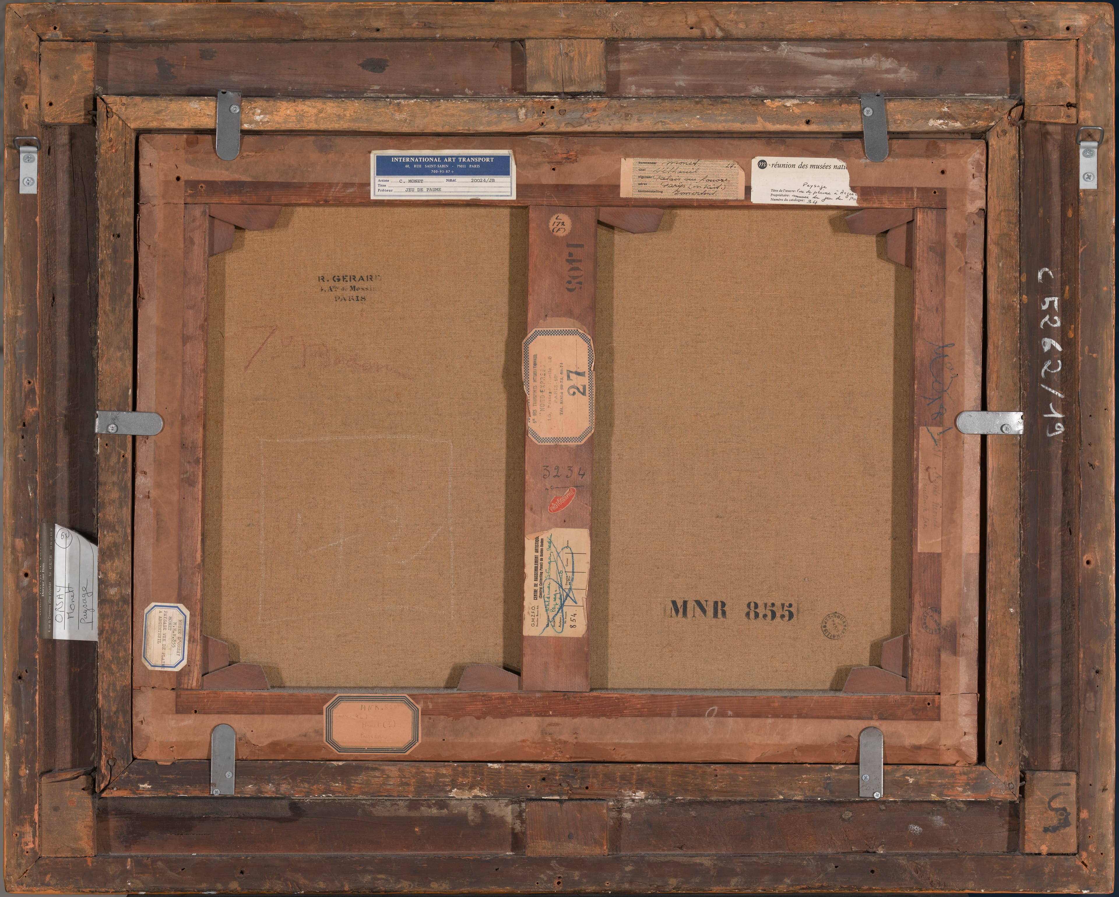 -Traverse médiane : Étiquette ronde dentelée « L/172/(F) » ; au pochoir noir « 1405 » ; étiquette rectangulaire à coins coupés bordée d'un rang de croisillons bleus « Sté des Transports Internationaux/'Nord-Express'/1-5passage Ruelle 1-5/Paris 18ème/Tél. NORD 69-73, 69-74/27 », recouvre une autre étiquette ; au crayon bleu « 3234 » souligné d'une flèche dirigée vers la gauche ; étiquette ovale rouge « Photographiée » ; étiquette rectangulaire « G.M.Z.F.O./Direction Beaux-Arts/Centre de rassemblement artistique (Central Collecting Point) de Baden-Baden/Origine : Waldemar Strenger, Baden/Sujet : Paysage/Auteur : Claude Monet/N° Invent. 854/Salle/Étagère ou mur/Casier/Caisse ».