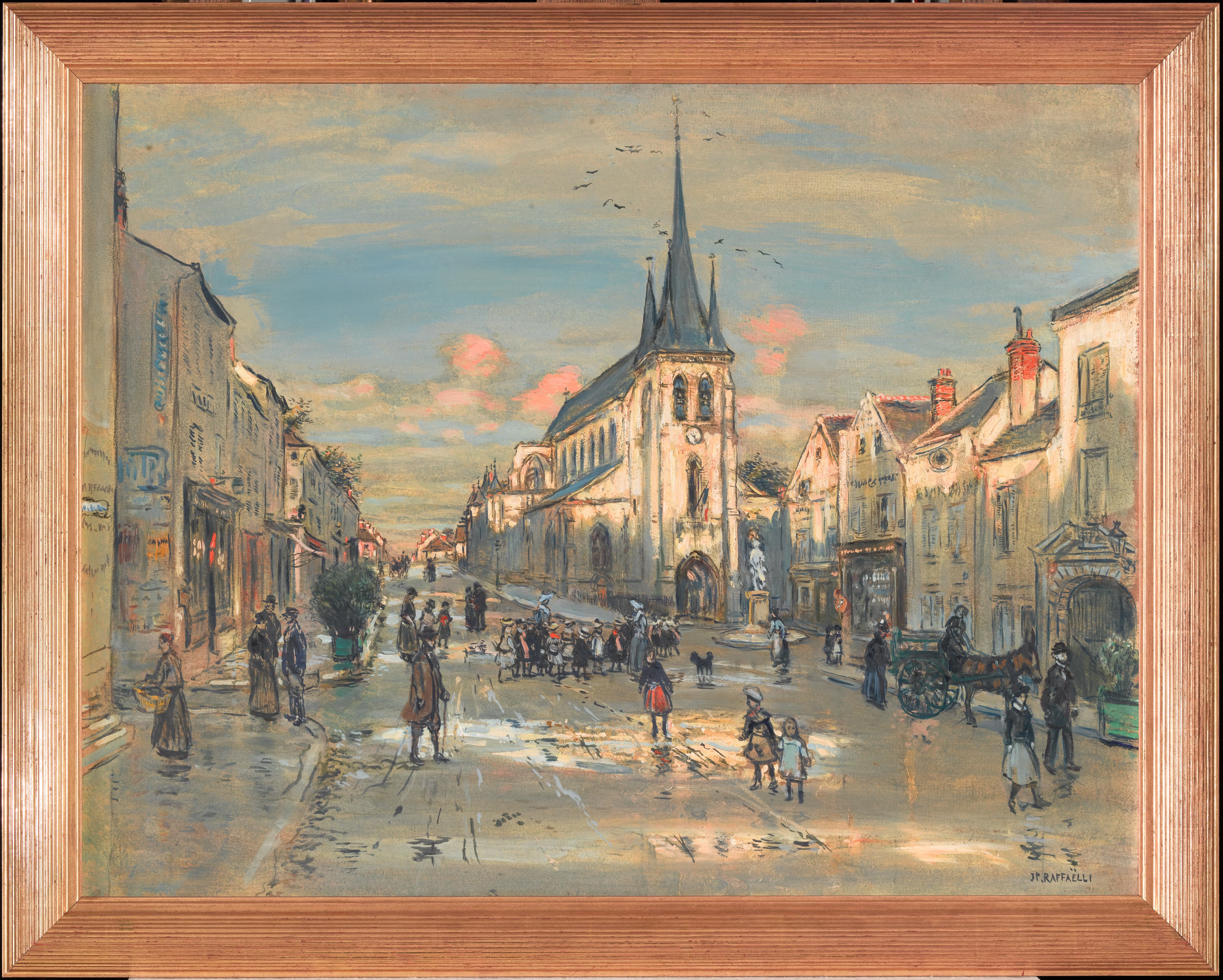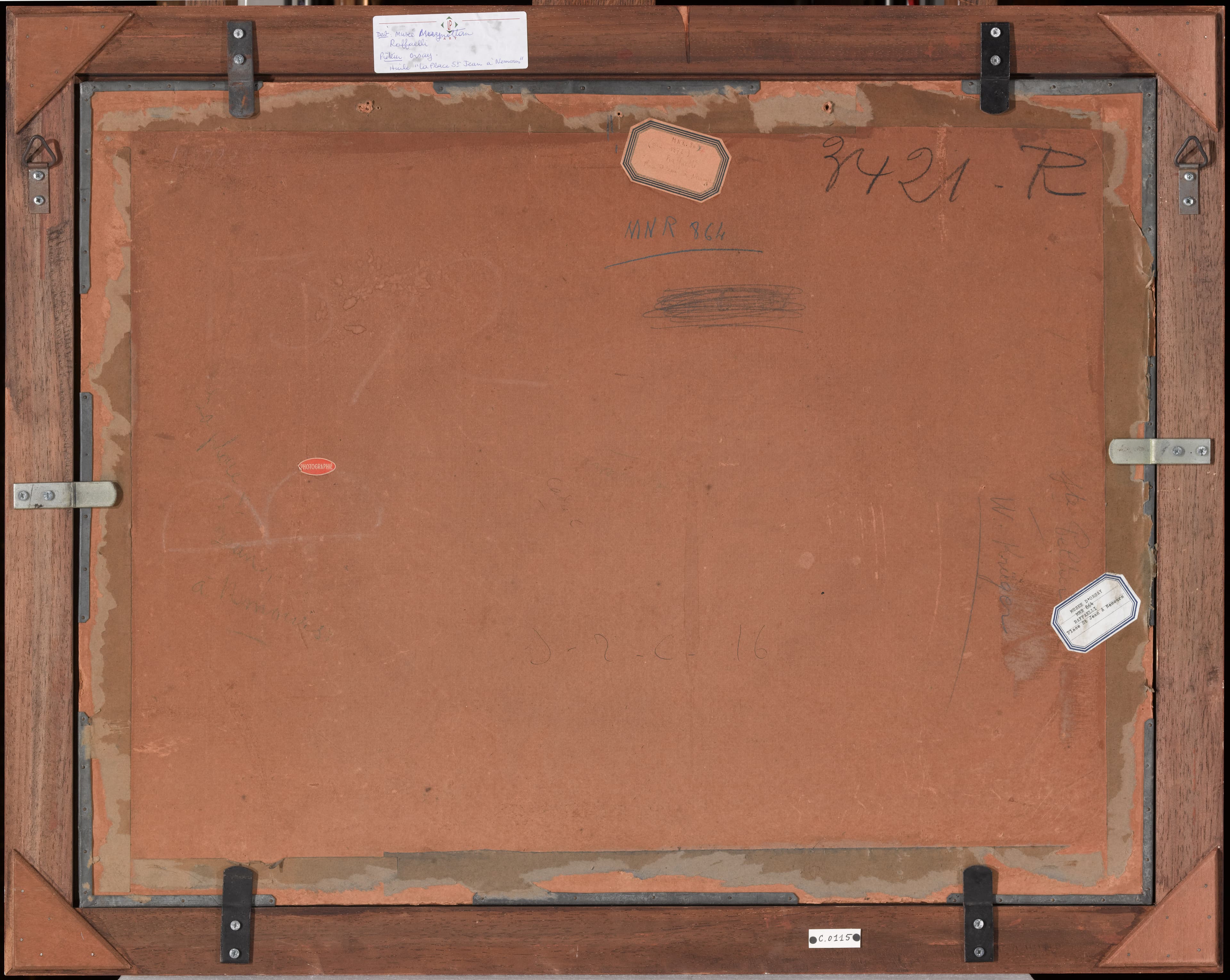 Sur le carton : A la craie blanche « N° 7228 » (?) ; trace d'étiquette ; étiquette rectangulaire à coins coupés bordée de bleu « MNR 861 (rectifié 864)/(anc.1372)/Raffaëlli/Place St Jean à Nemours » ; au crayon noir « 3421-R » ; au crayon bleu « MNR 864 » ; numéro rayé « 1372 » encadré à la craie blanche très effacée ; étiquette rouge ovale « Photographié » ; en blanc « B » ; en bleu « La place/St/Jean/à Nemours » ; au crayon « Cadre C » au milieu ; au dessus, inscription en bleu illisible ; à droite au crayon « Sté Peltier/W. Krüger » (souligné) ; étiquette rectangulaire à coins coupés bordée de bleu « Musée d'Orsay/MNR 864/Raffaëlli/Place St Jean à Nemours » ; au crayon « S-2-C-16 ».