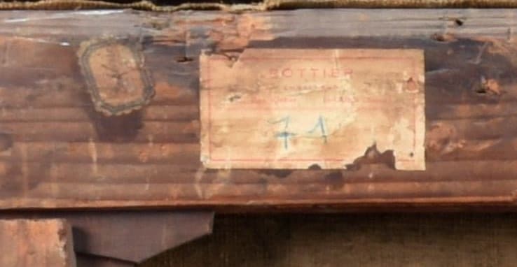 -Montant supérieur : Étiquette rectangulaire à pans coupés et liserés bleus : « Natoire »(?) ; étiquette rectangulaire à liserés rouges « Pottier/emballeur/.../71 » [45, rue Kléber St Ouen (Seine)] ; étiquette rectangulaire à pans coupés à liserés bleus « MNR 897/Natoire/La Pêche » ; tampon à l »encre noire ; étiquette lacunaire ; étiquette ovale « Photographie » ; au crayon bleu : une croix ; au feutre noir « MNR 897 ».