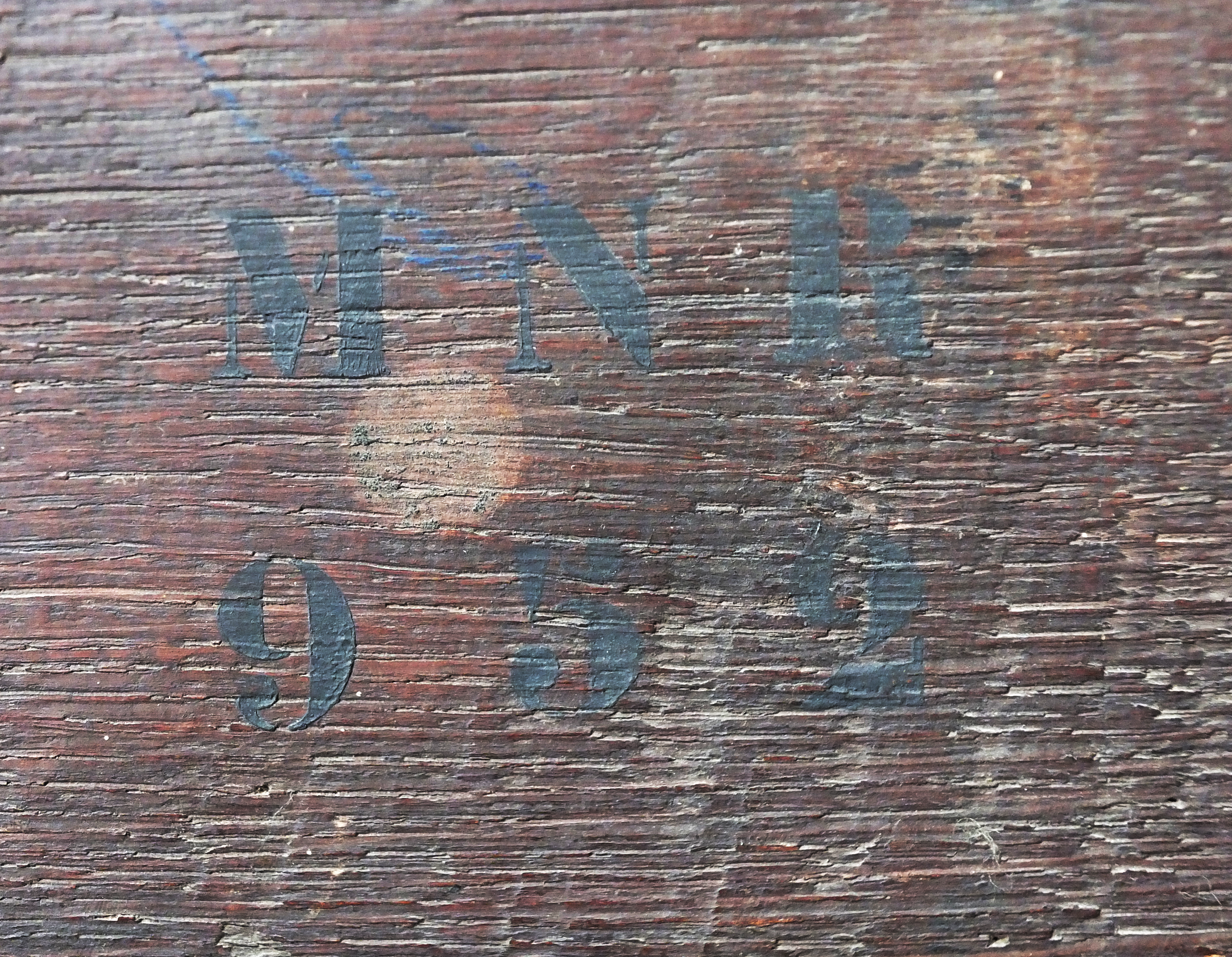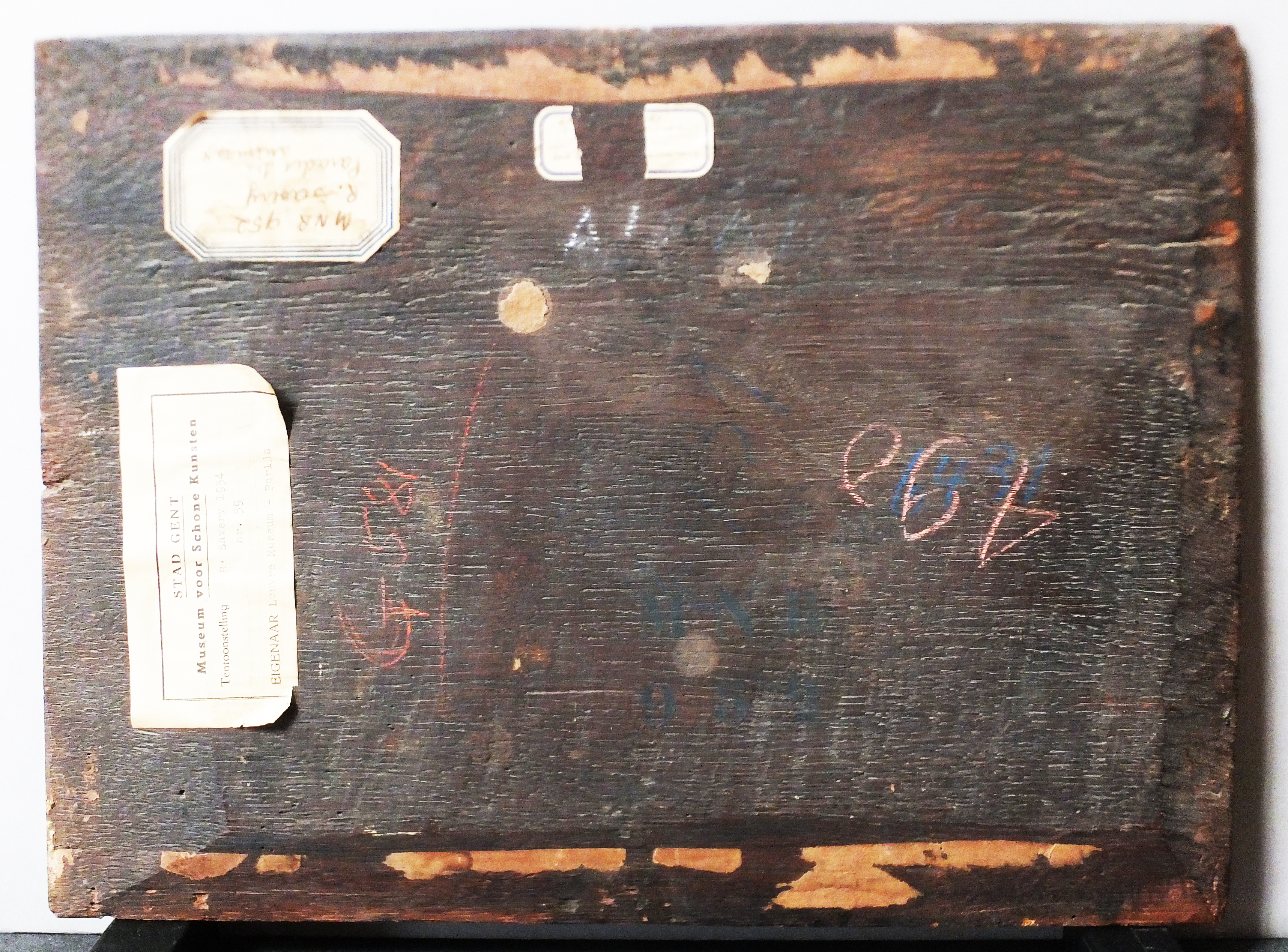-Montant supérieur : Au pochoir "MNR 952" ; au crayon bleu "M/42" ; étiquette "Savery ancien cadre MNR 952" ; étiquette déchirée avec inscription illisible.