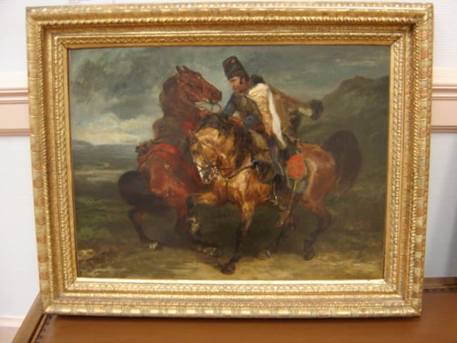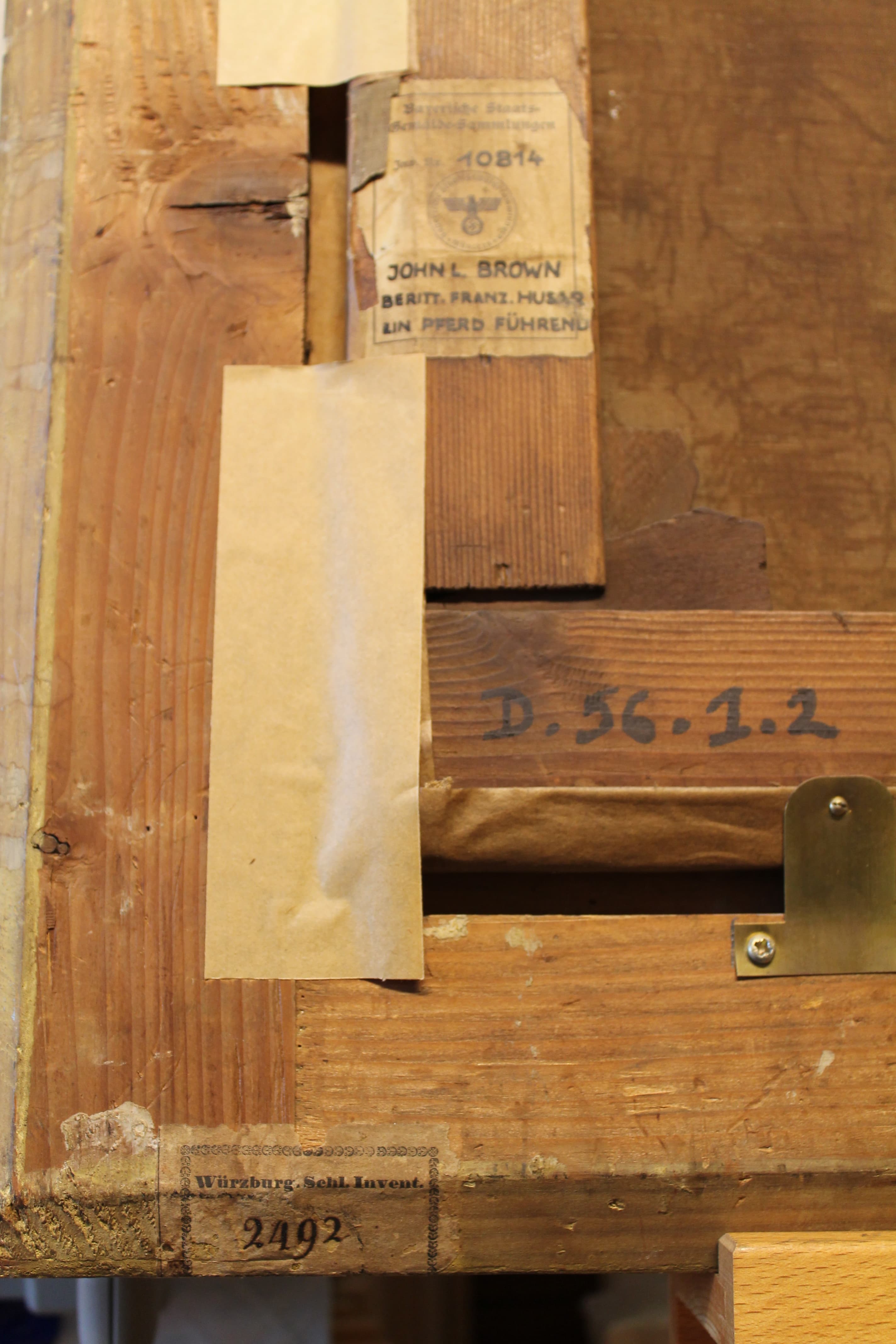 Sur le châssis : Inscription : "R2 1/3" ; étiquette "MNR 955 C459/J. Lewis Brown/Hussard" ; tampon douane (?) "n°21 14" ; étiquette "Bayerische Staats-Gëmalde Sammlungen/Inv. n° 10814/John L. Brown/Beritt (?) Franz. Husar/Ein Pford Führer..."