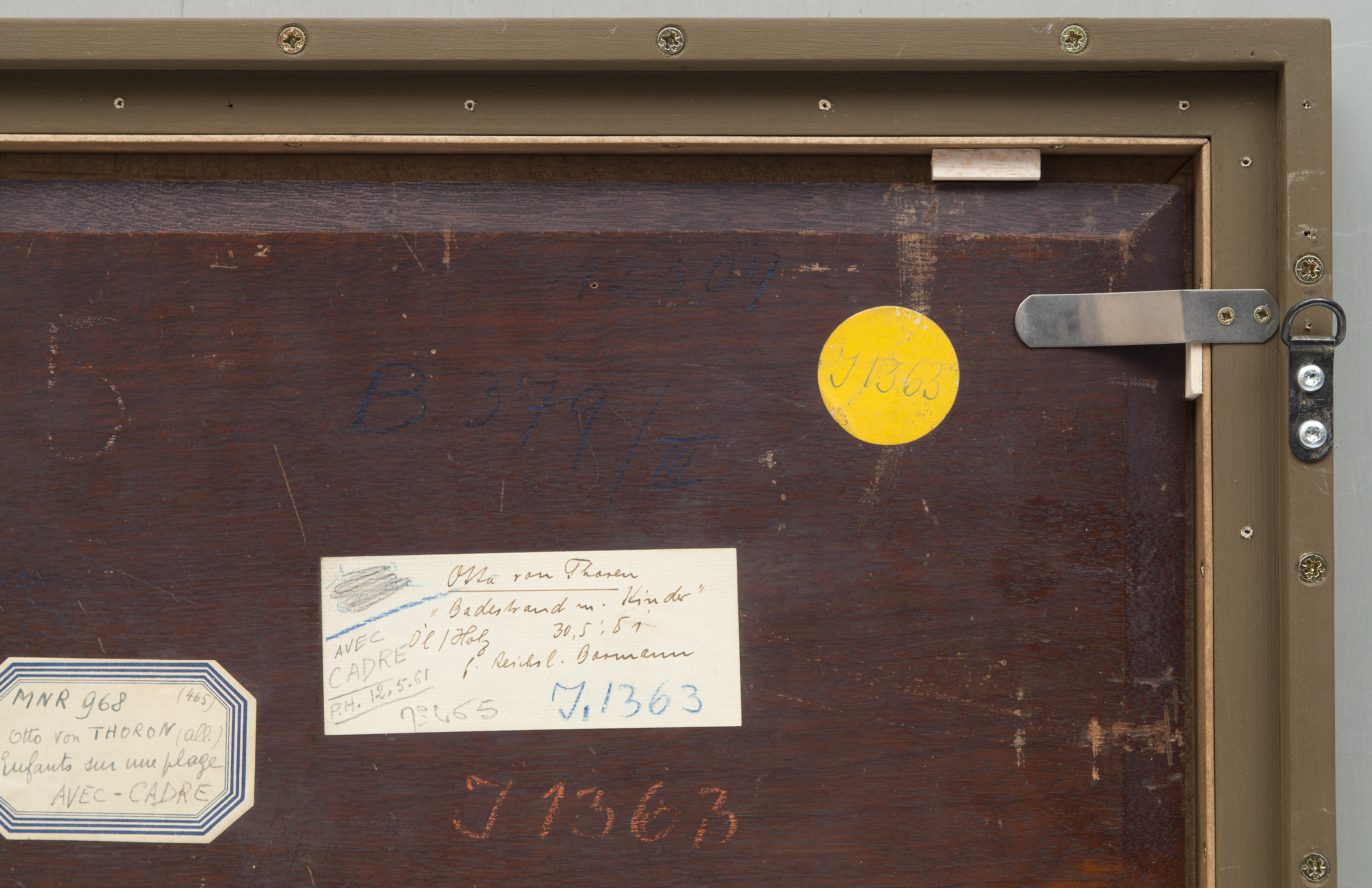 Sur le panneau : Au crayon bleu « sans cadre » ; à la craie blanche « 465 » ; à la craie orange « J 1363 » ; au crayon bleu « B379/ III » et « 12309 » ; pastille jaune « J 1363 » ; étiquette rectangulaire « Ossa von Thoren/...Badestrand m. Kinder.../Öl/ Holz/30,5 : 51/F. Reichsl . Bormann/(ajout) J. 1363/(ajout postérieur) Sans cadre (à la craie bleue)/(au graphite) Avec cadre/P.H. 12.5.61/n° 465 » ; étiquette rectangulaire à coins coupés et listel bleu « MNR 968/(465)/Otho von Thoron (sic) (all.)/Enfants sur une plage/Avec cadre » ; étiquette rectangulaire à coins ronds « LP Arts-Bureaux de Paris/IP.3.04.008.FM/Tel 0149353000/Fax 0149353510/Dossier Normandie impressionniste/Préteur : Château-musée de Dieppe-Dieppe/Titre 0293 Enfants jouant sur la plage de Trouville/Dépôt d'Orsay D961.1.1 (MNR 968) ».