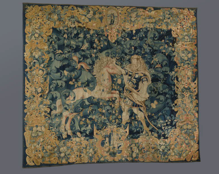 Hercule tourné vers la gauche, tenant sa massue de la main gauche, et revêtu de la peau de lion, arrête de la main droite un cheval, allant vers la gauche, dont il tient la crinière. Très large bordure sur fond jaune à motifs de cuirs découpés, fleurs et fruits ; médaillon supérieur : la Musique [MUSICA] ; médaillon inférieur : un roi, deux guerriers et un enfant (David et Salomon ?).