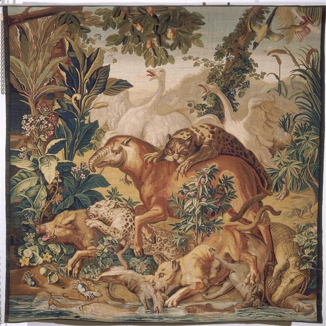 Fragment de tapisserie, sans bordure, représentant, au centre, un tigre, qui enfonce ses crocs et ses griffes dans le dos d'un tapir ; un autre tigre se jette sur un sanglier ; une lionne égorge une antilope, et un crocodile, à gauche, égorge un mouton. Tous ces animaux sont tournés vers la gauche. Au deuxième plan, deux autruches, le bec ouvert, battent des ailes ; en avant, dans l'eau, plusieurs poissons, parmi lesquels on distingue un hippocampe.